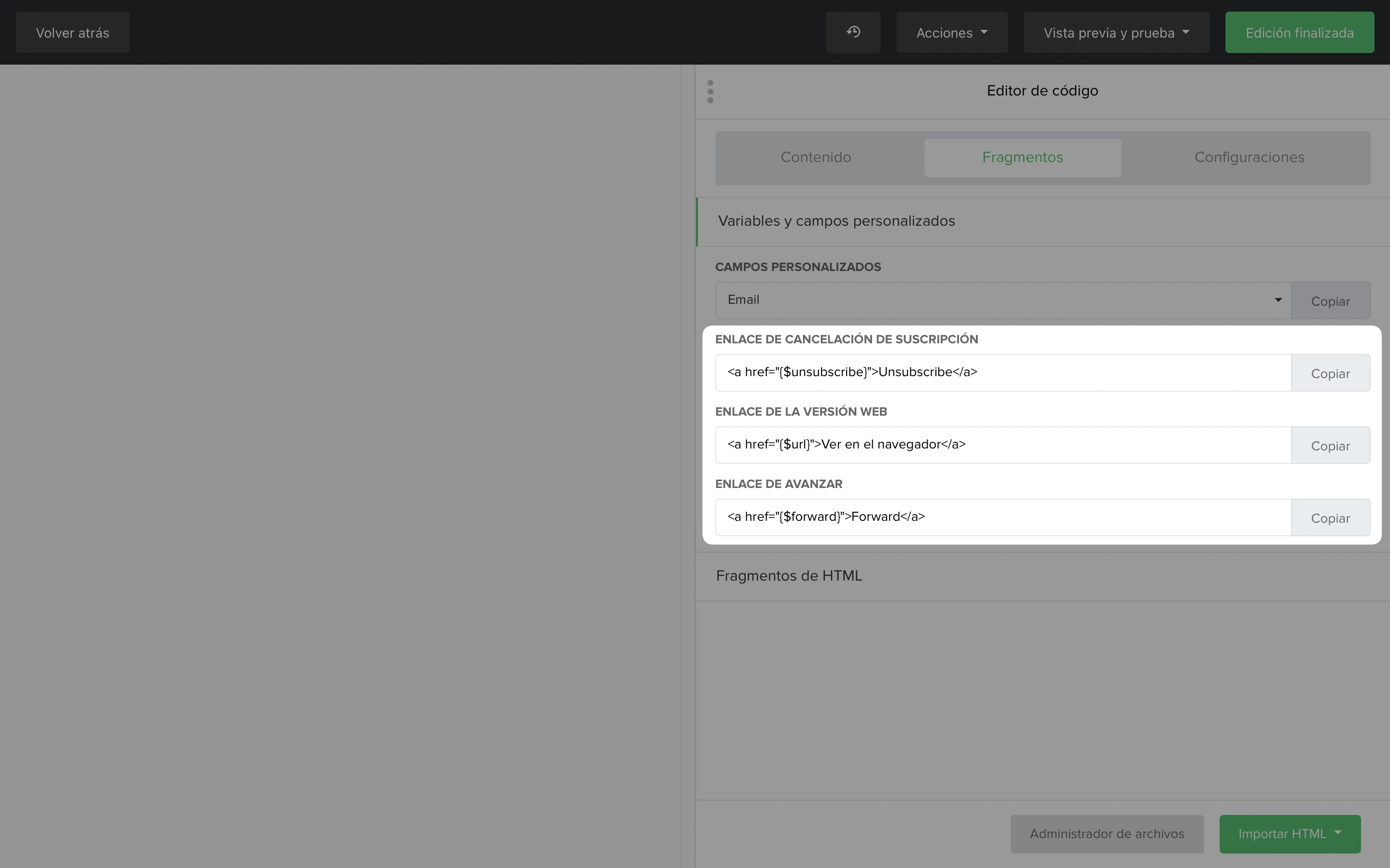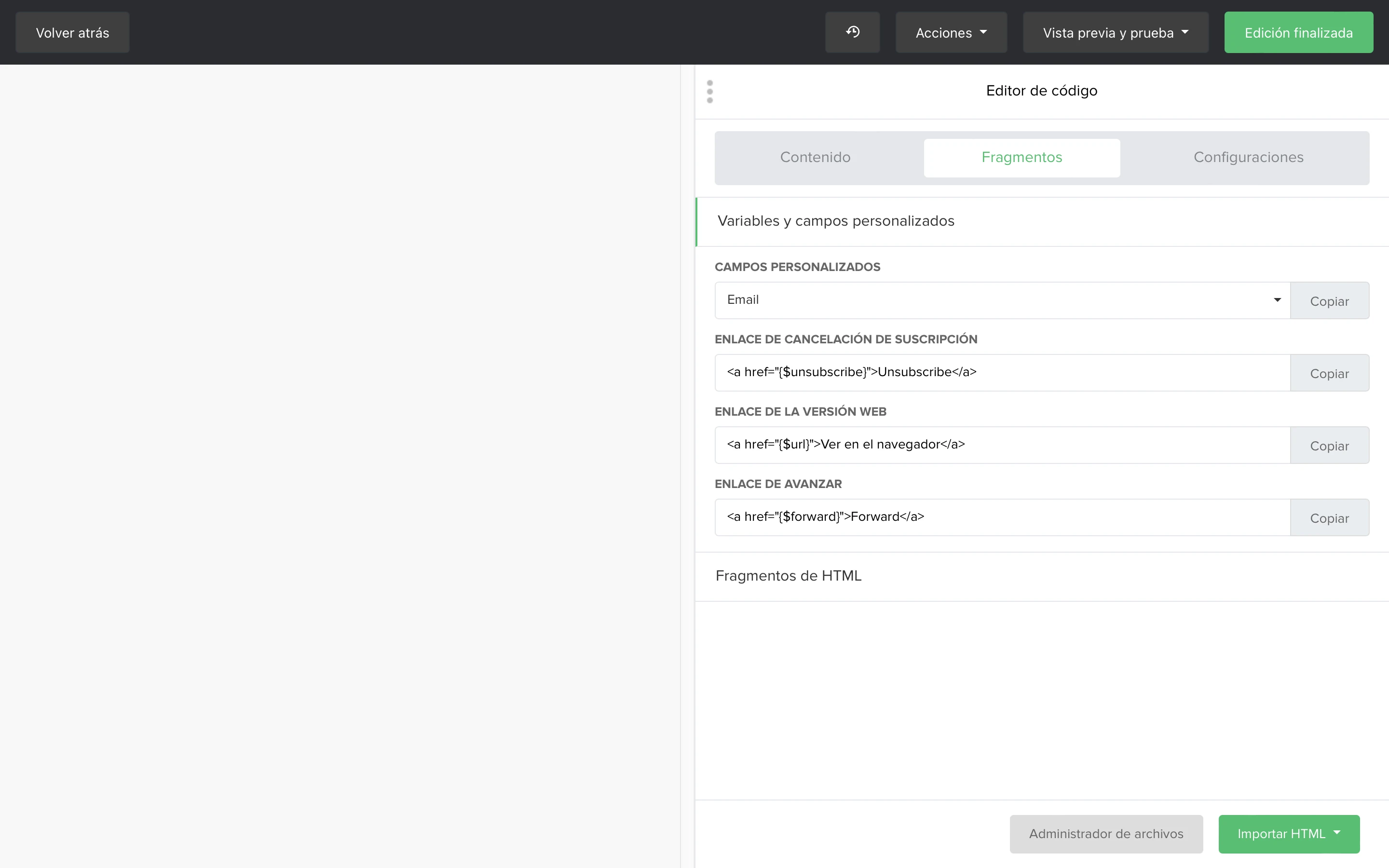 Fragmentos de HTML disponibles en el editor HTML personalizado