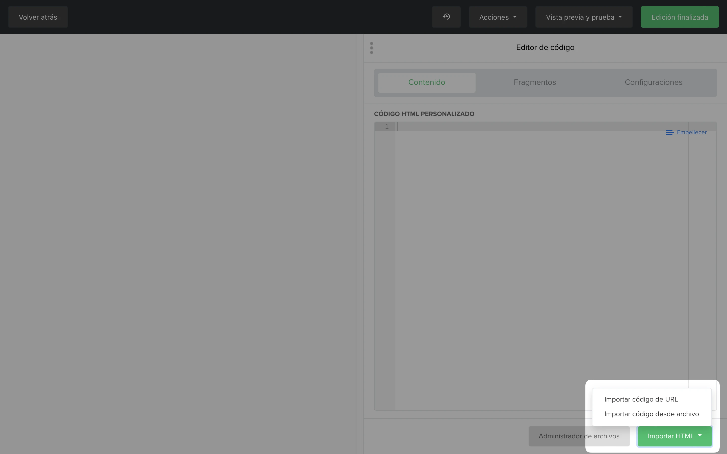 7. Al seleccionar el botón Importar HTML, puedes elegir Importar código desde URL o Importar código desde archivo.