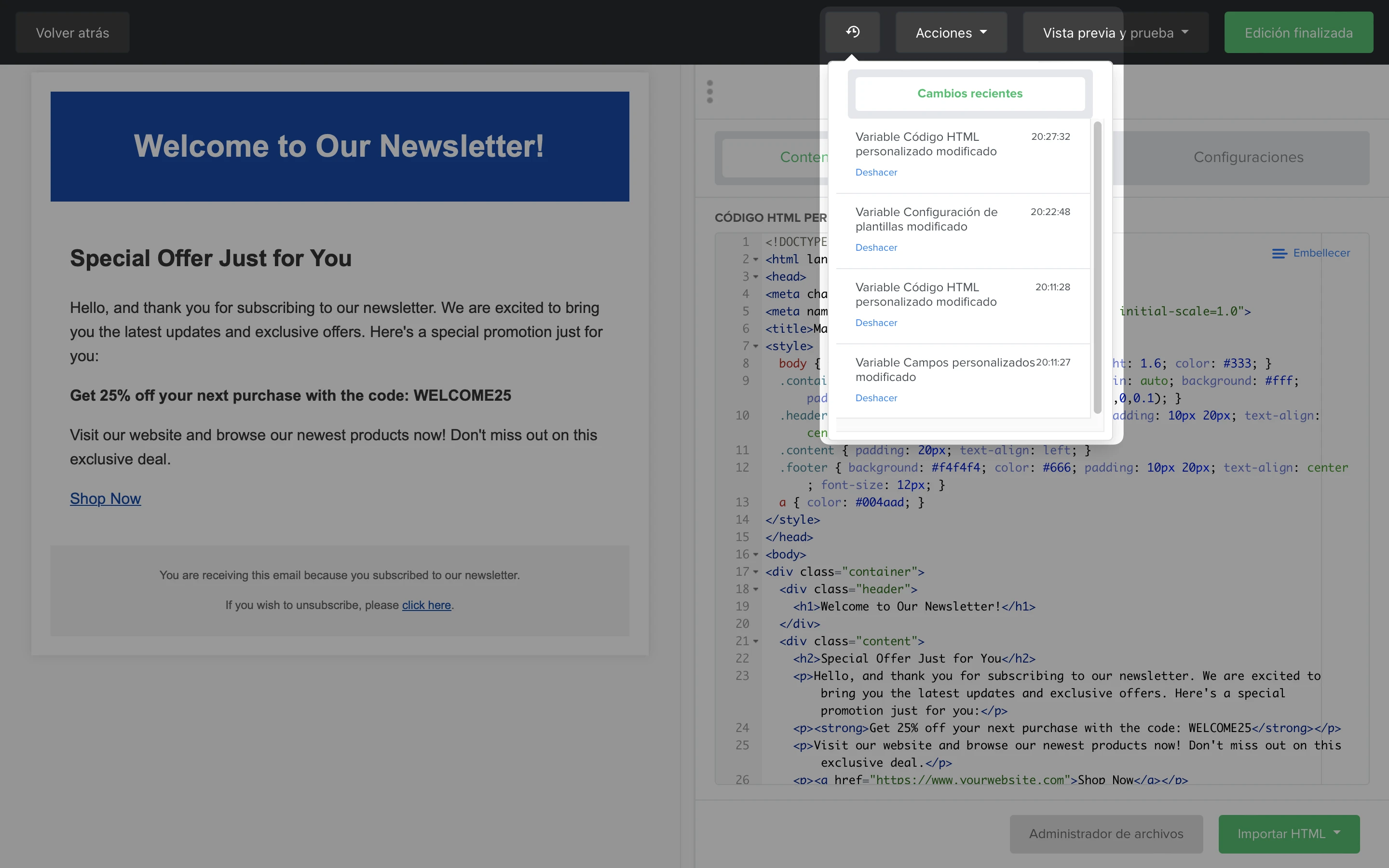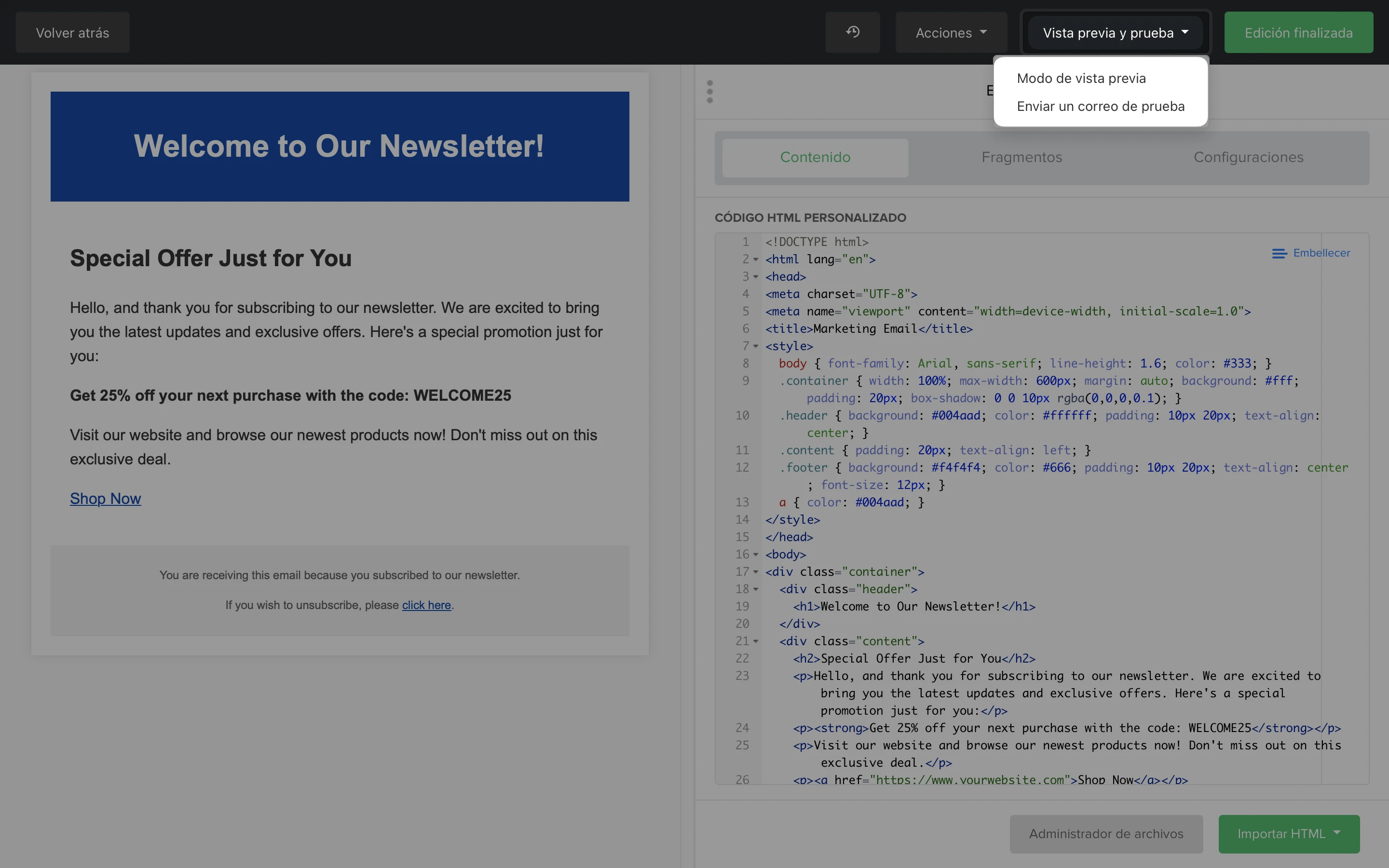 El editor HTML personalizado permite a los principiantes y expertos en HTML crear y enviar newsletters o boletines personalizados creados desde cero.
