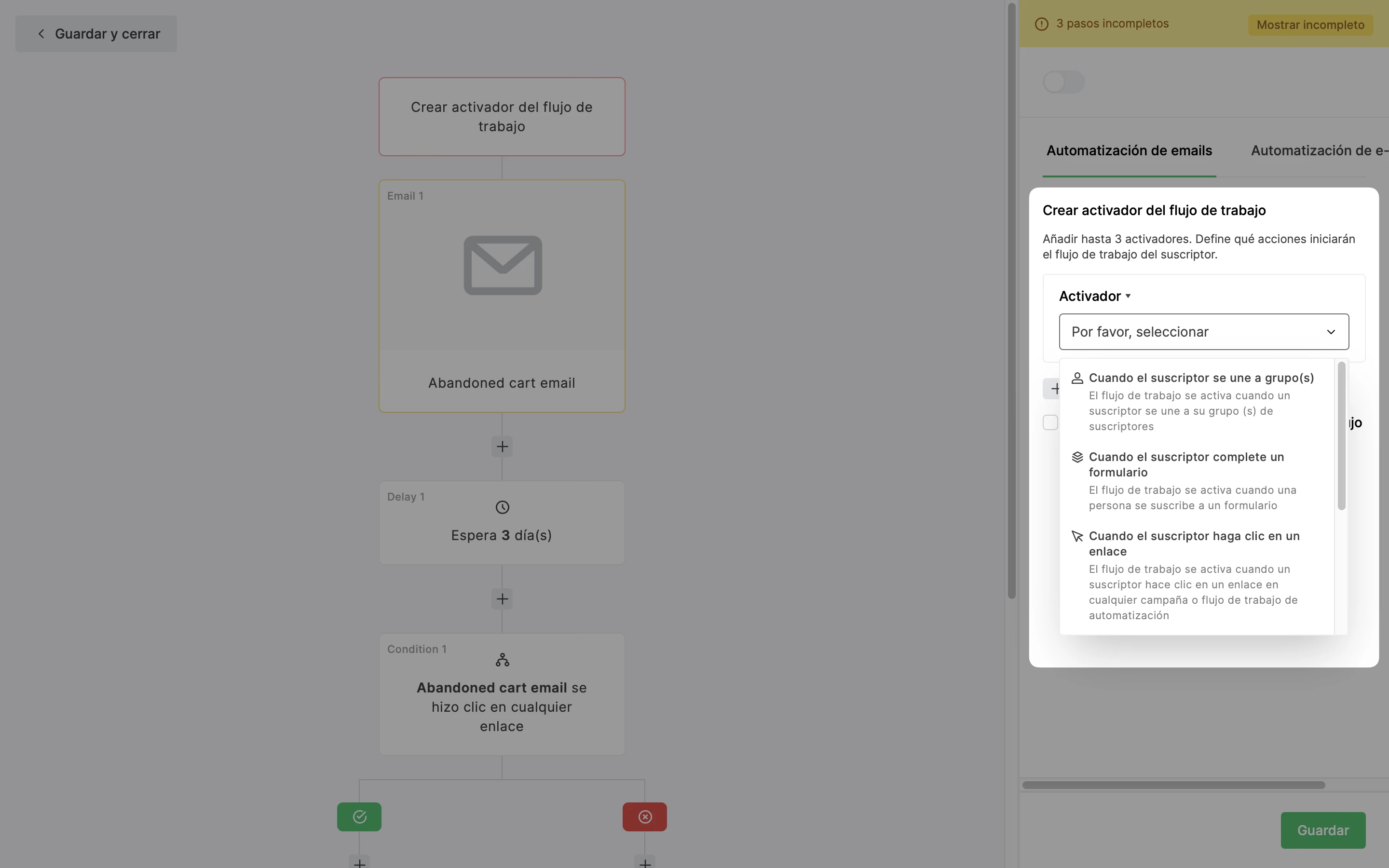 Nota: Actualmente, esta función sólo se aplica a los disparadores predeterminados de MailerLite. En este momento no existe la opción de aplicar múltiples disparadores de e-commerce.