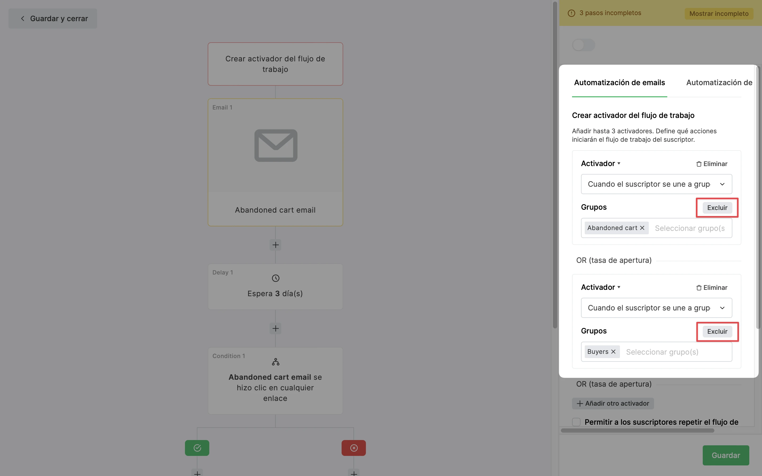 Si deseas excluir un grupo de suscriptores de un flujo de trabajo con múltiples disparadores, debes excluir ese grupo en la configuración de todos los disparadores del flujo de trabajo.