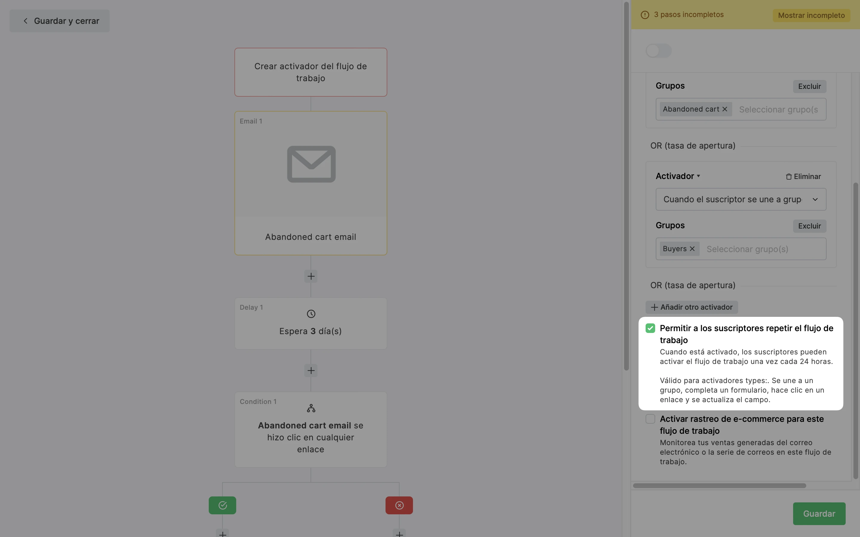 Algunos disparadores tienen la opción de repetirse cada vez que un suscriptor cumple las reglas del evento disparador. Sólo tienes que marcar la casilla de la barra lateral con la etiqueta Permitir que los suscriptores repitan el flujo de trabajo. Estos disparadores son:
