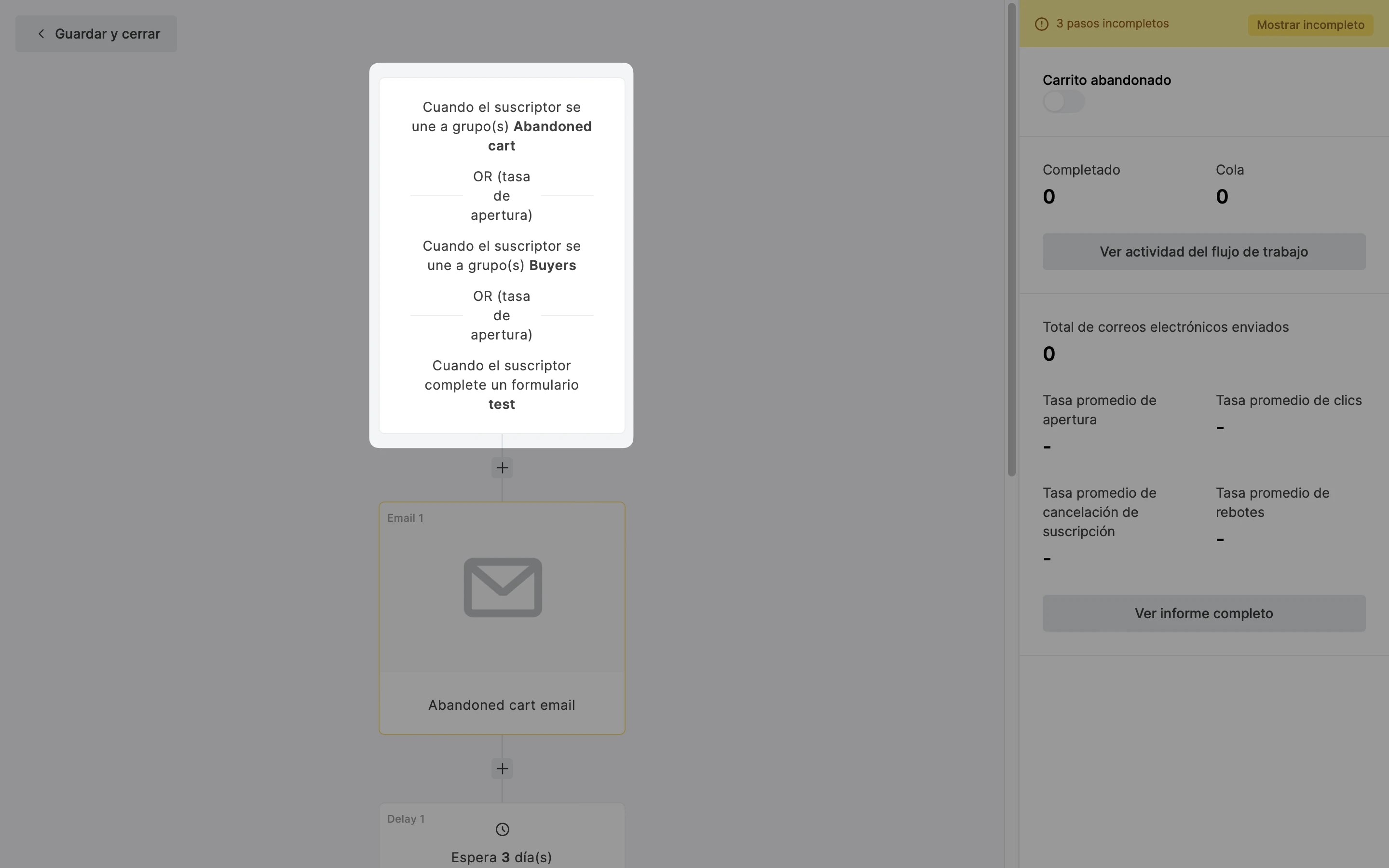 Para que un suscriptor active un flujo de trabajo que contiene múltiples disparadores, sólo deben cumplir las reglas de un disparador. Por ejemplo, si tu flujo de trabajo contiene 3 disparadores que comienzan cada uno con "cuando un suscriptor se une a un grupo", entonces un suscriptor sólo necesitaría unirse a uno de los grupos de disparadores para entrar en el flujo de trabajo.