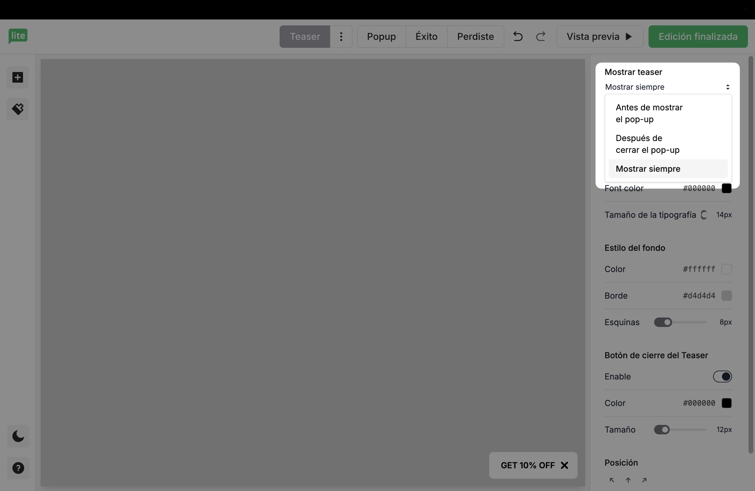 Mostrar siempre: El teaser permanece visible en todo momento (antes y después de que aparezca la ventana pop-up principal). Esta es la configuración por defecto.