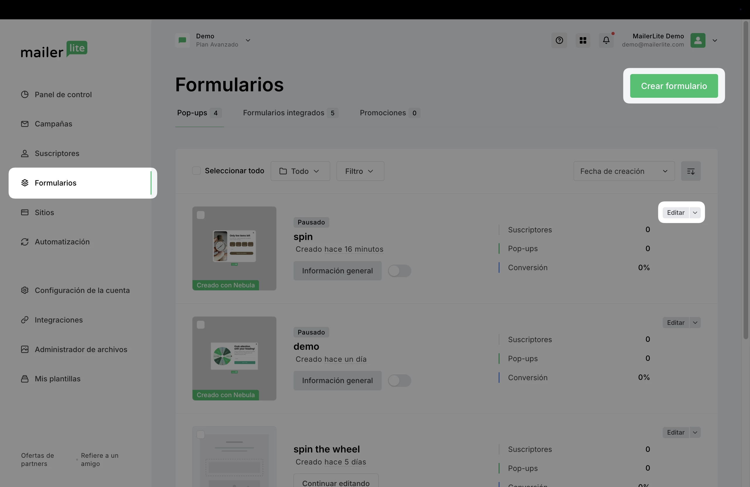 1. Navega hasta Formularios y elige el pop-up que quieras editar, o crea una nueva.