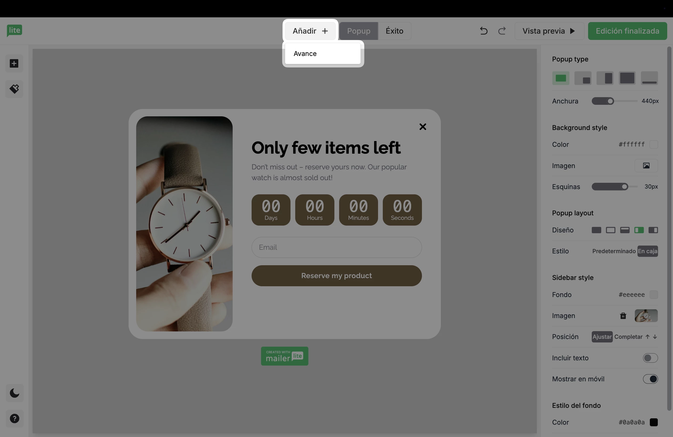 Cuando un visitante hace clic en el teaser, éste se expande en una ventana pop-up completa (o aparece después de que se cierre la ventana pop-up principal), lo que te permite compartir mensajes importantes como ofertas especiales, lanzamientos de productos o descuentos por tiempo limitado.