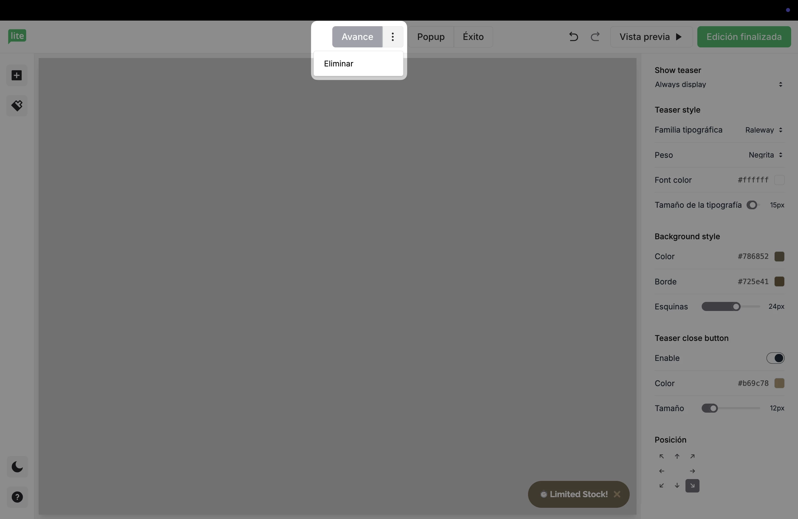 Para eliminar un teaser que se ha añadido a una ventana pop-up, simplemente utiliza los tres puntos horizontales de la parte superior del editor de teaser y haz clic en Eliminar.