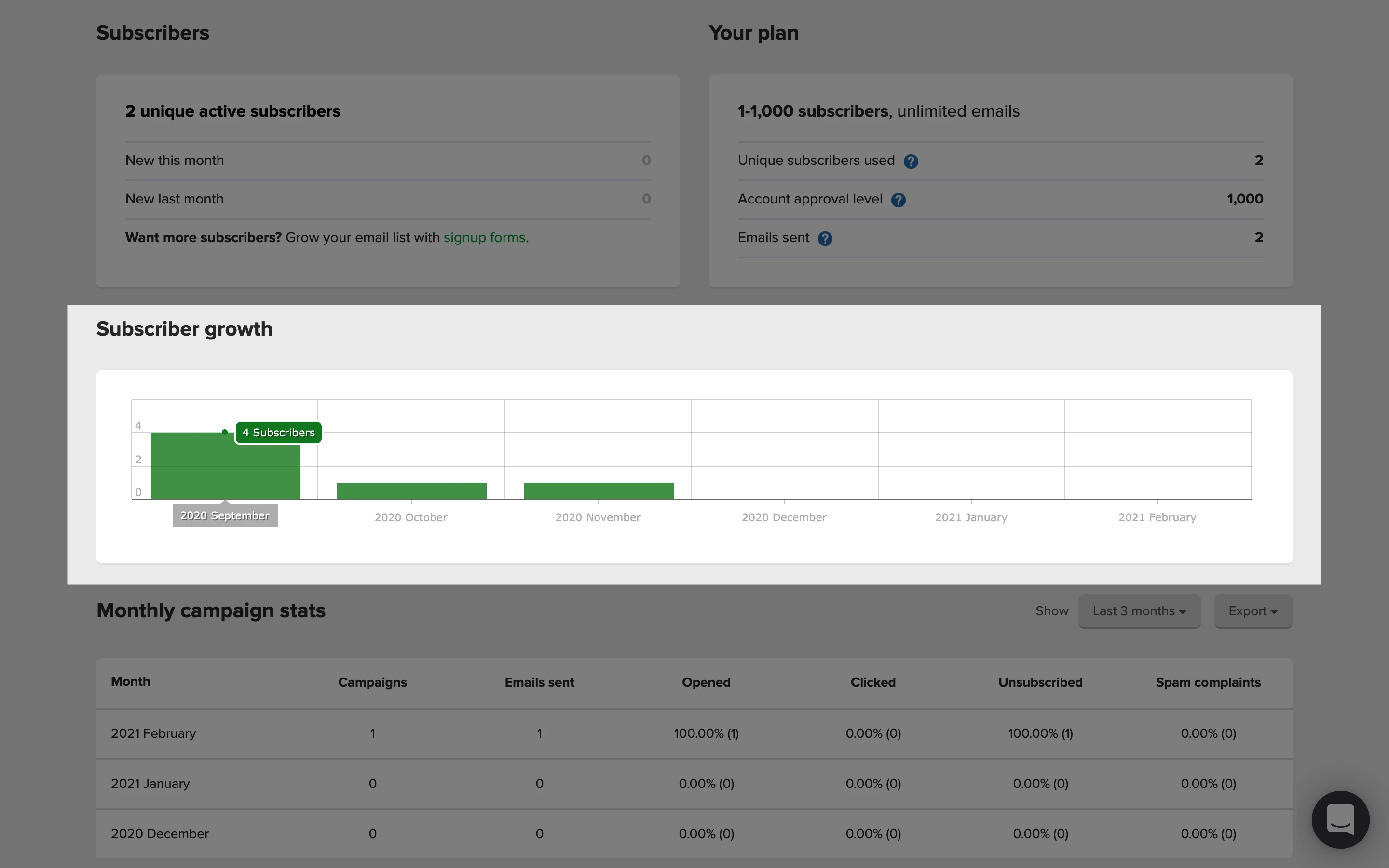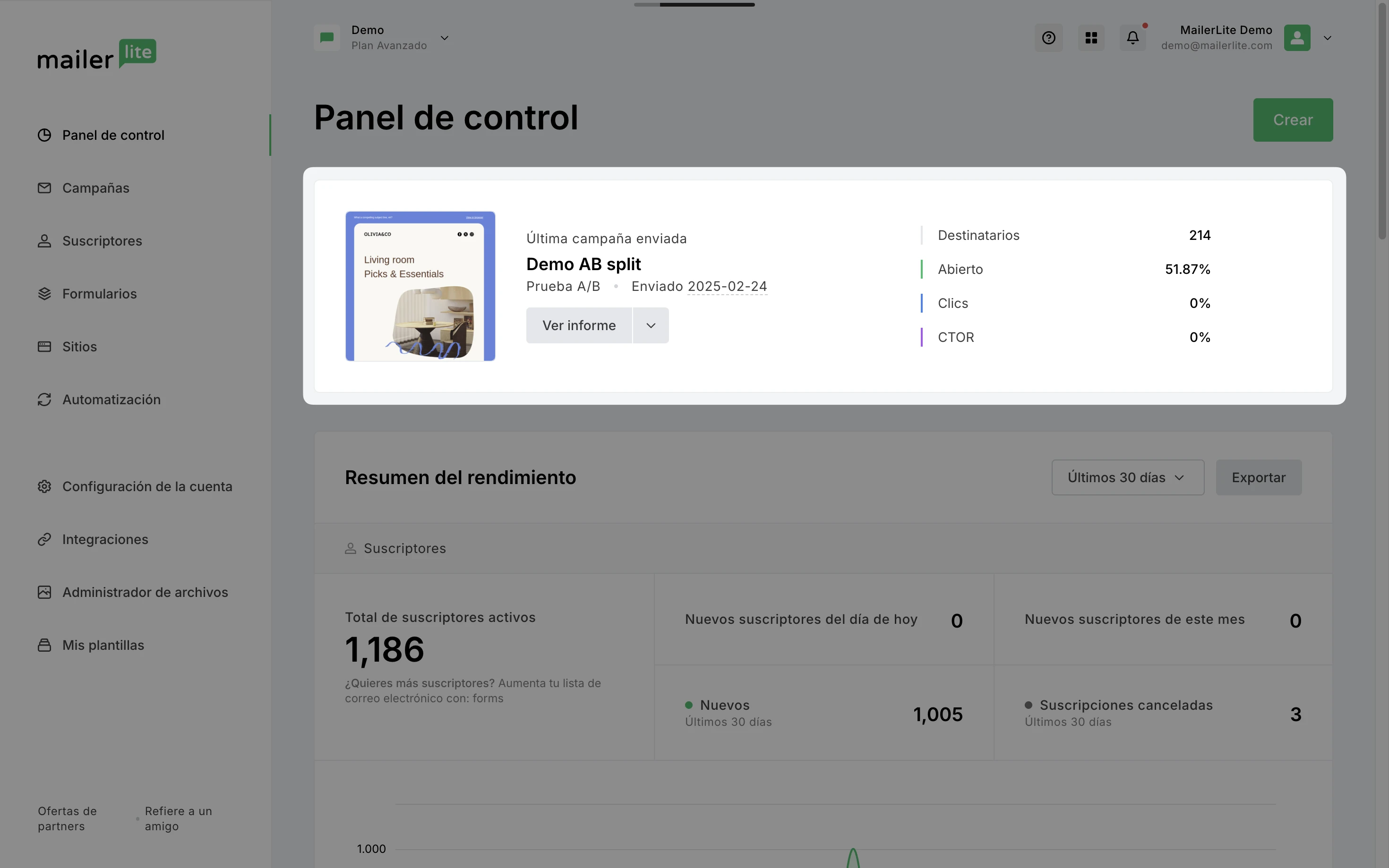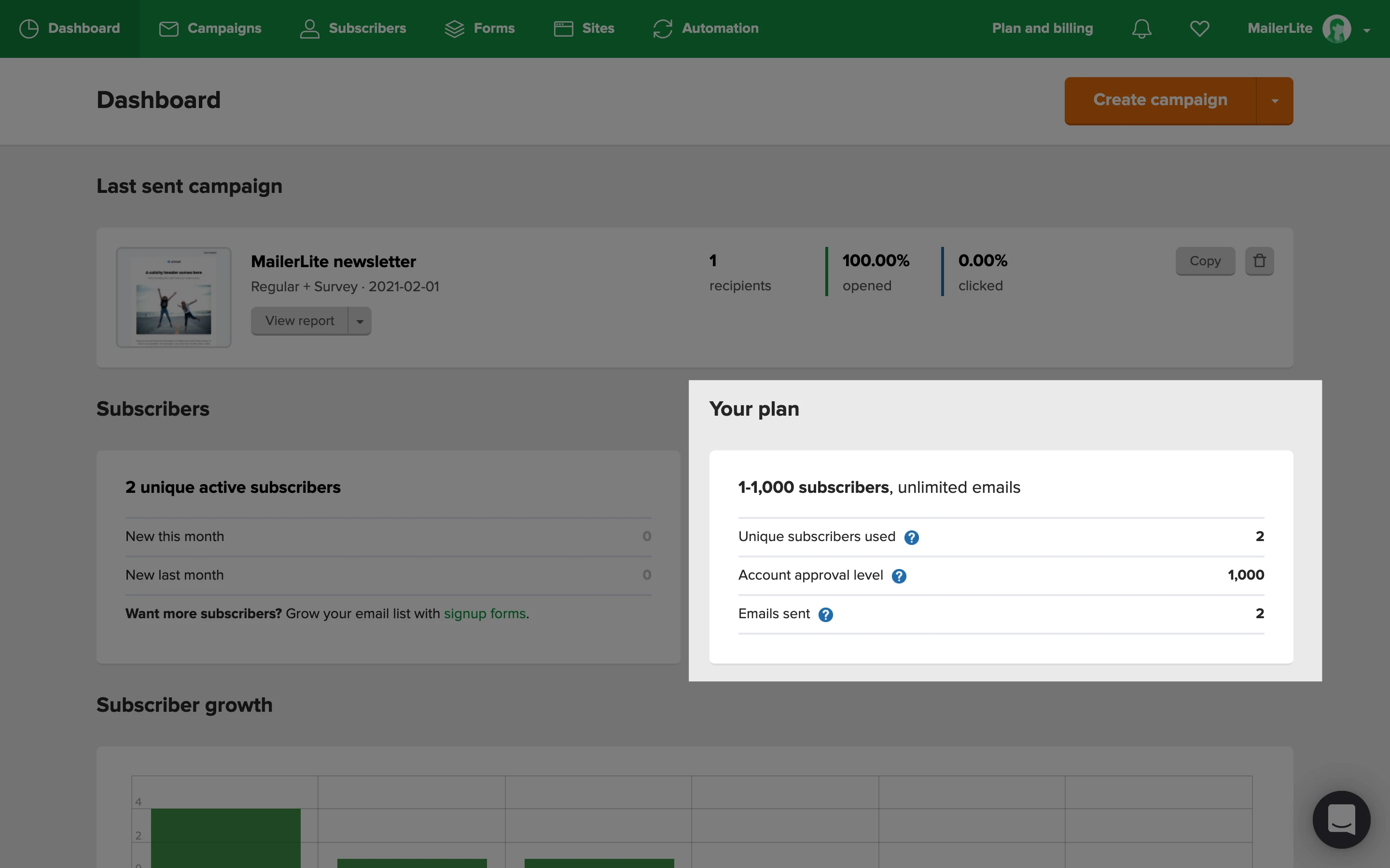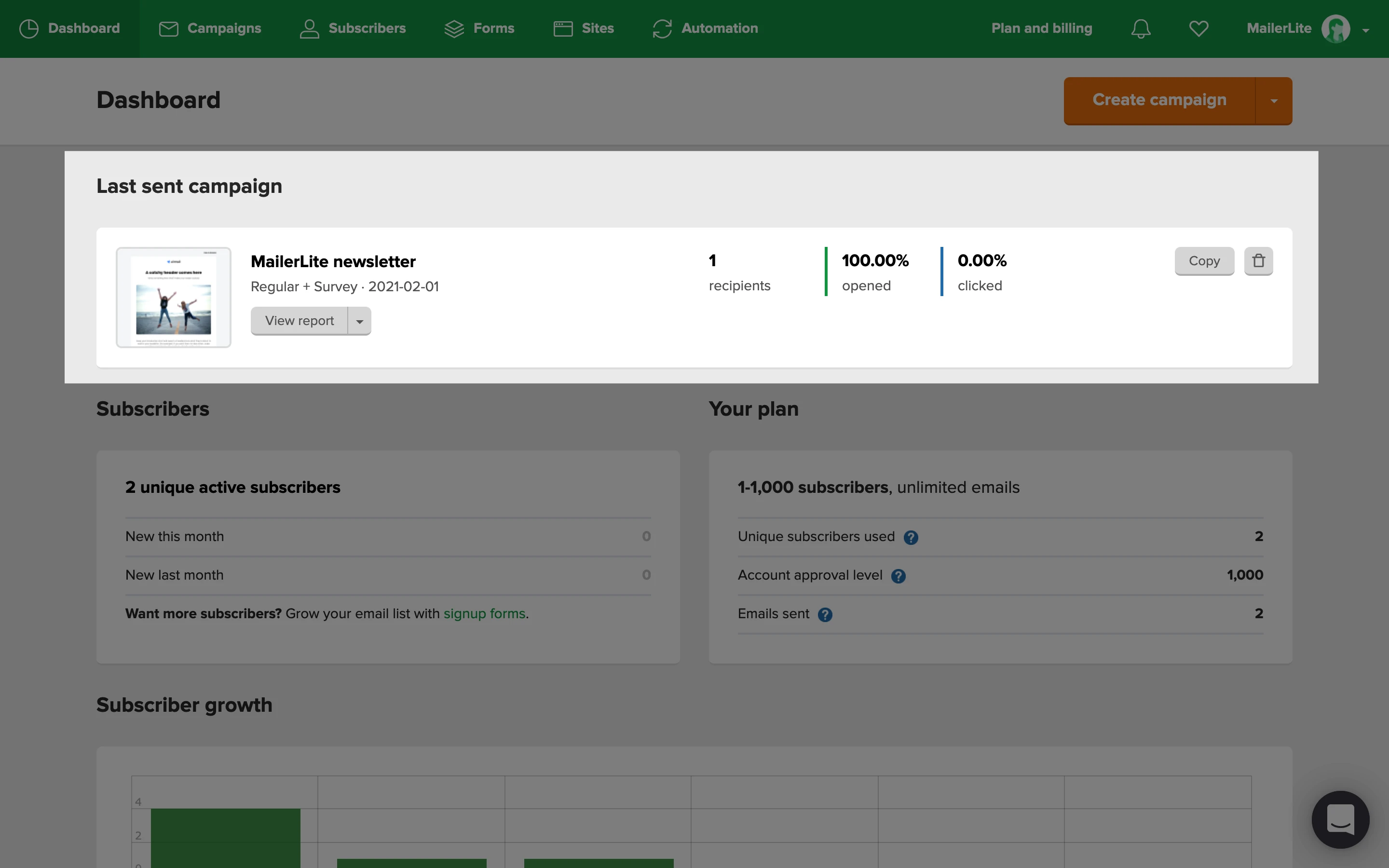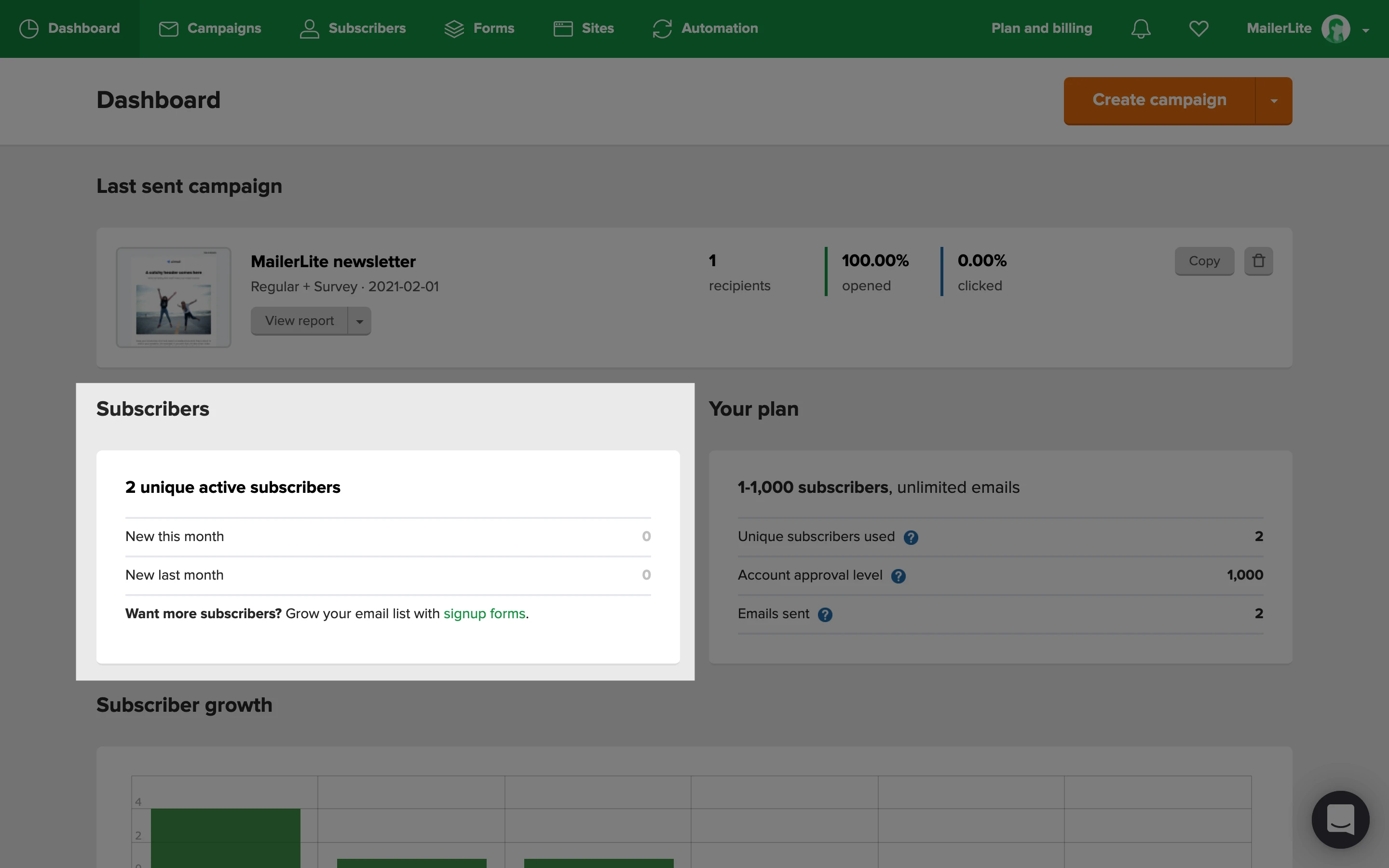 Cuando te conectes a tu cuenta de MailerLite, llegarás a tu panel de control. Aquí encontrarás un resumen de la actividad de tu cuenta para que la revises.
