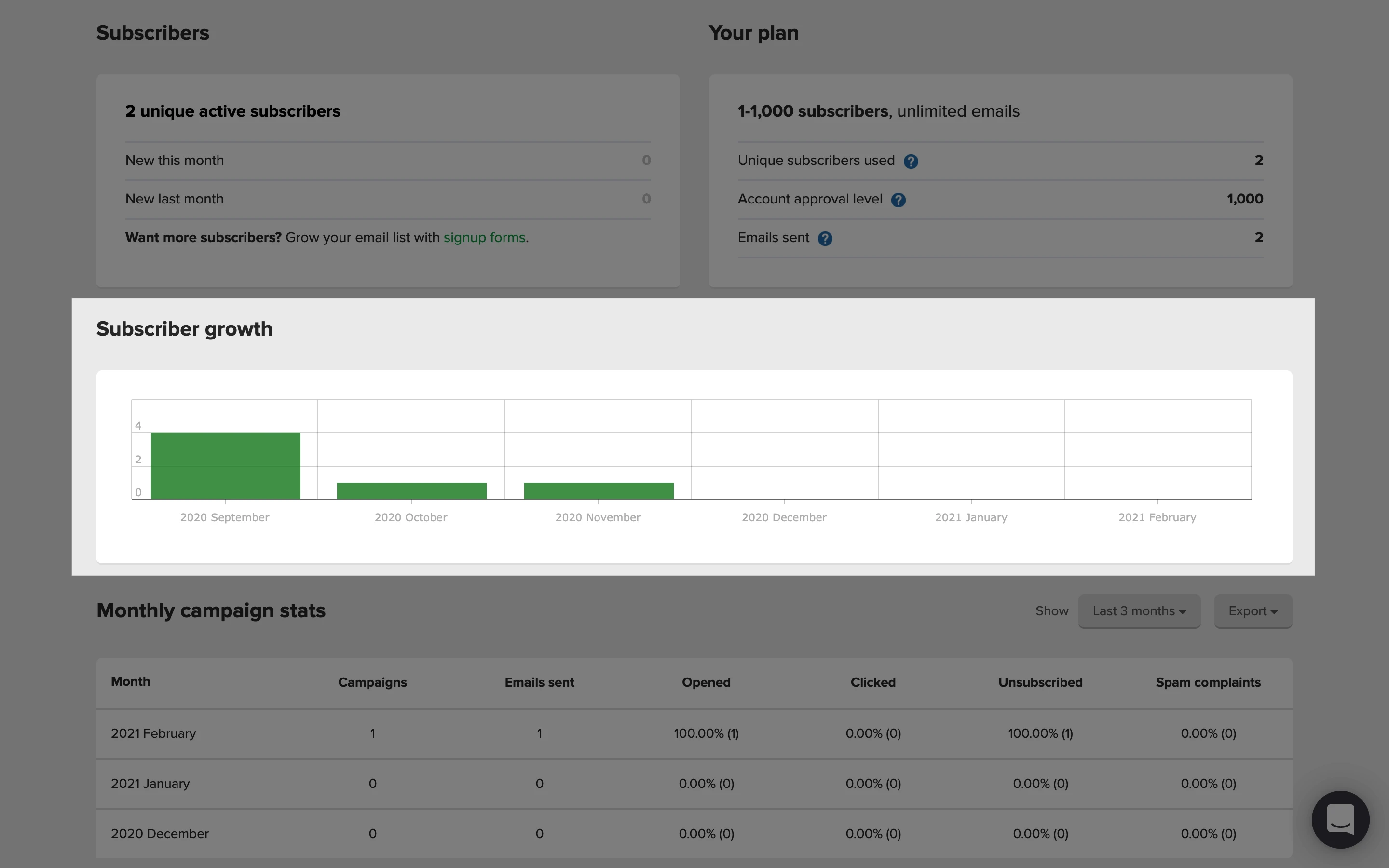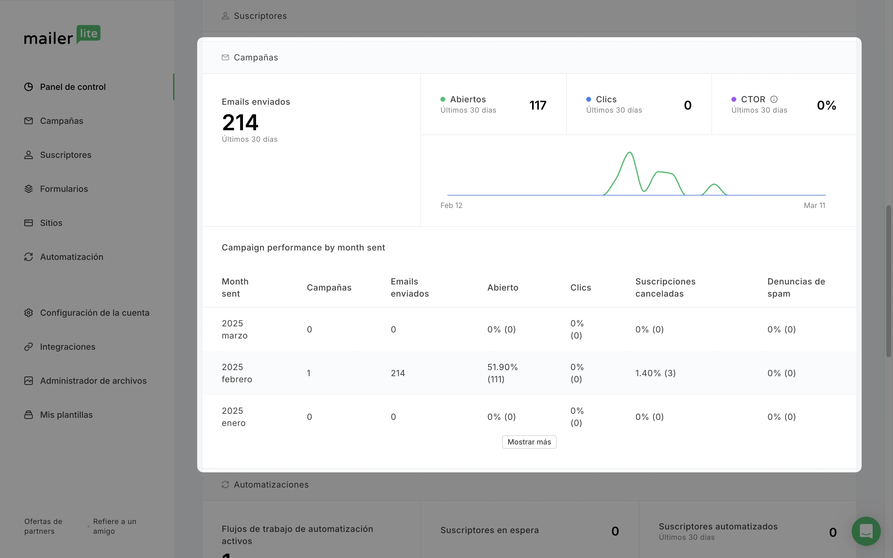 Puedes encontrar un gráfico de aperturas frente a clics debajo de estas estadísticas, así como una tabla que también muestra las tasas de bajas y quejas por spam al mes.