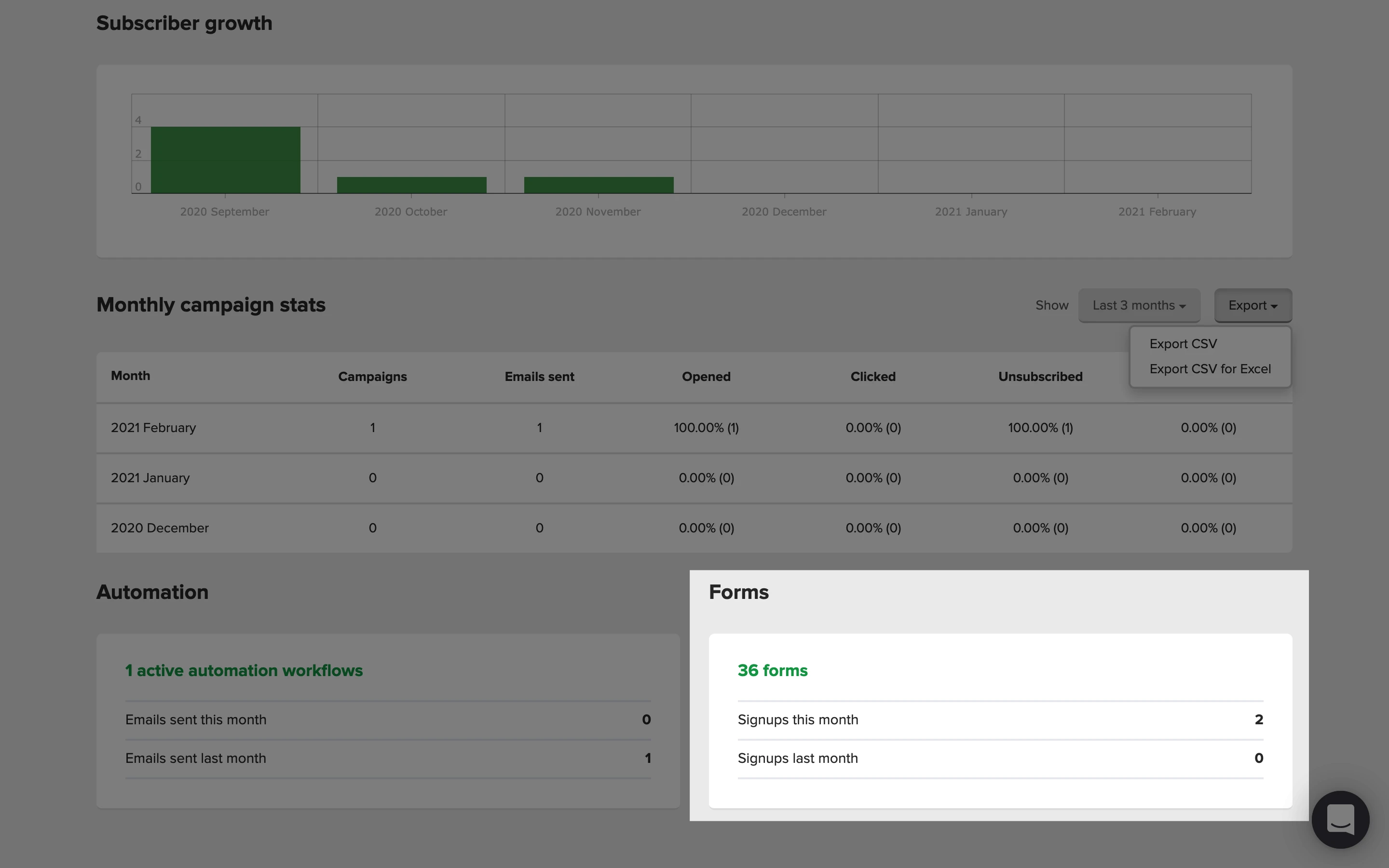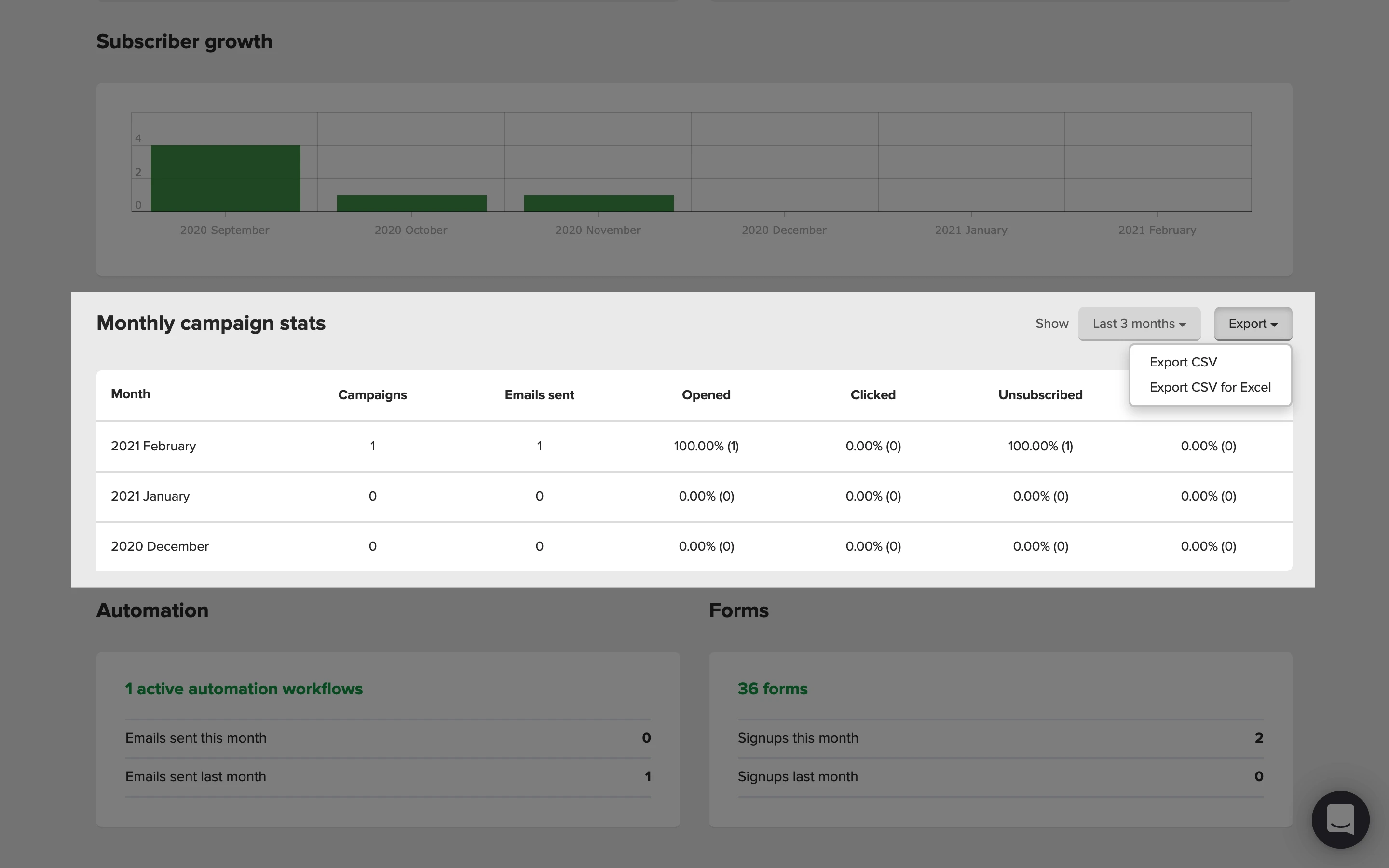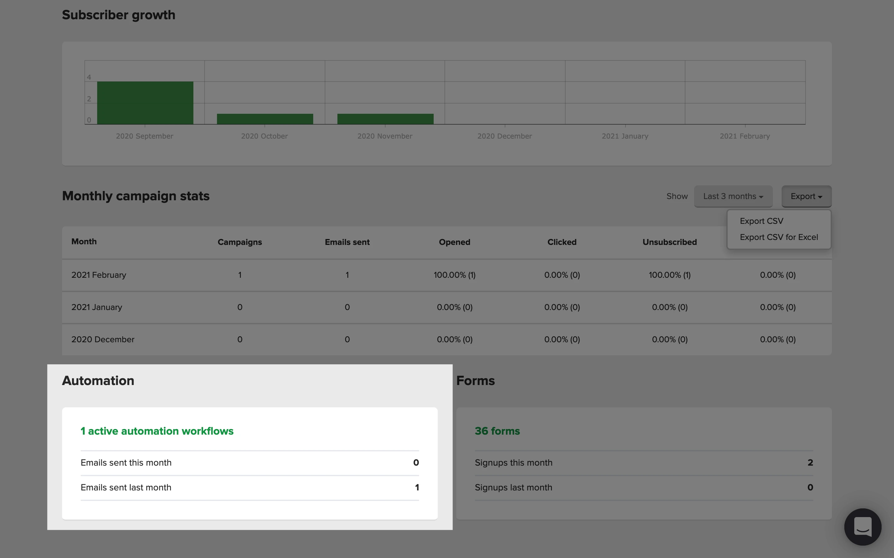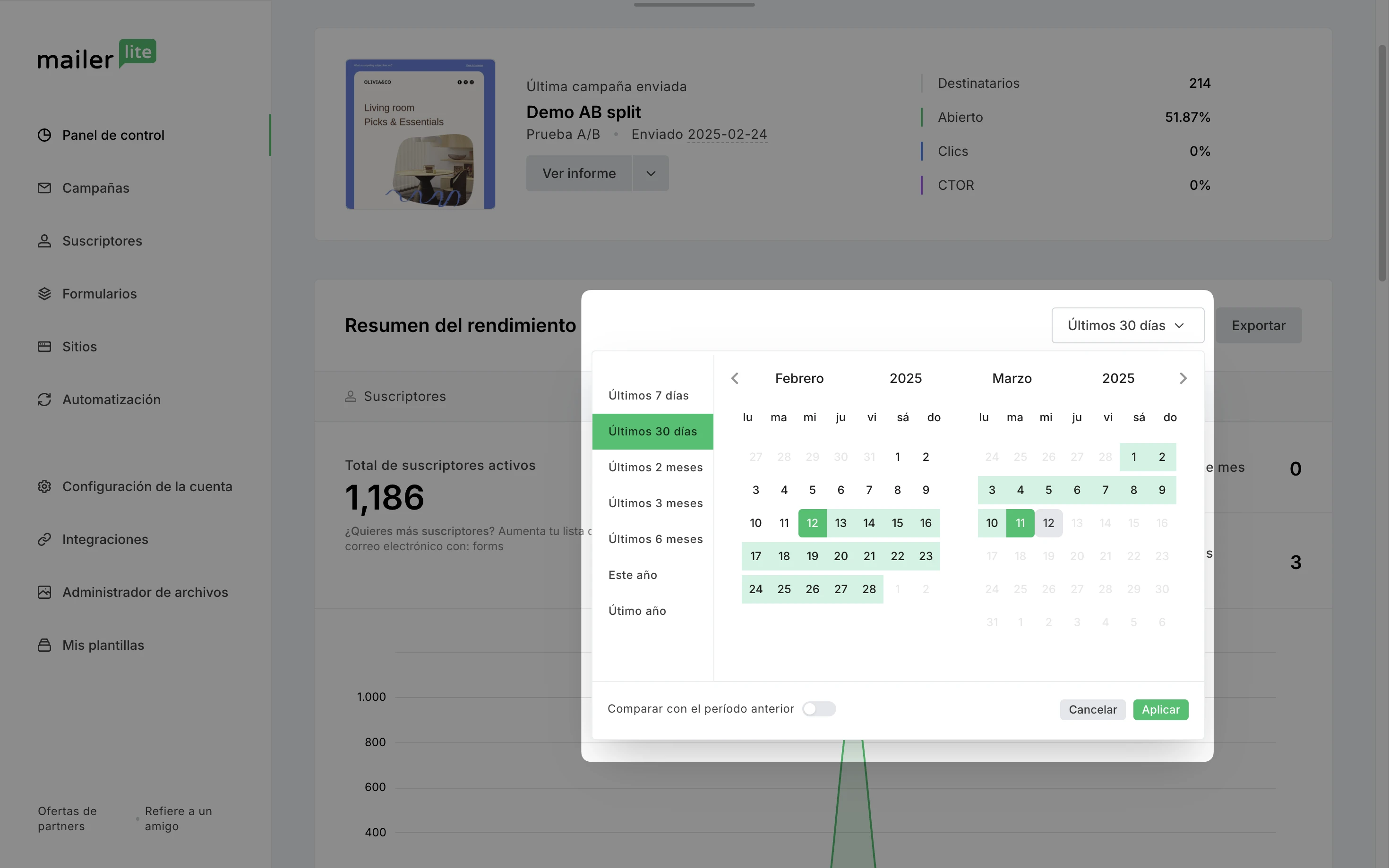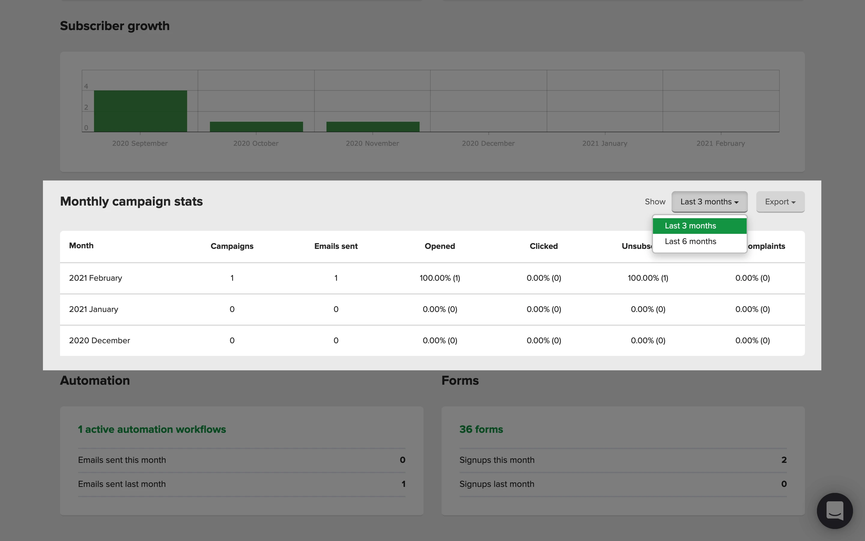 Después, encontrarás los informes generales de rendimiento de tus suscriptores, campañas, automatizaciones, formularios y sitios. Puedes filtrar estos informes por tiempo: últimos 7 días, últimos 30 días, últimos 2 meses, últimos 3 meses, últimos 6 meses, este año o el año pasado.