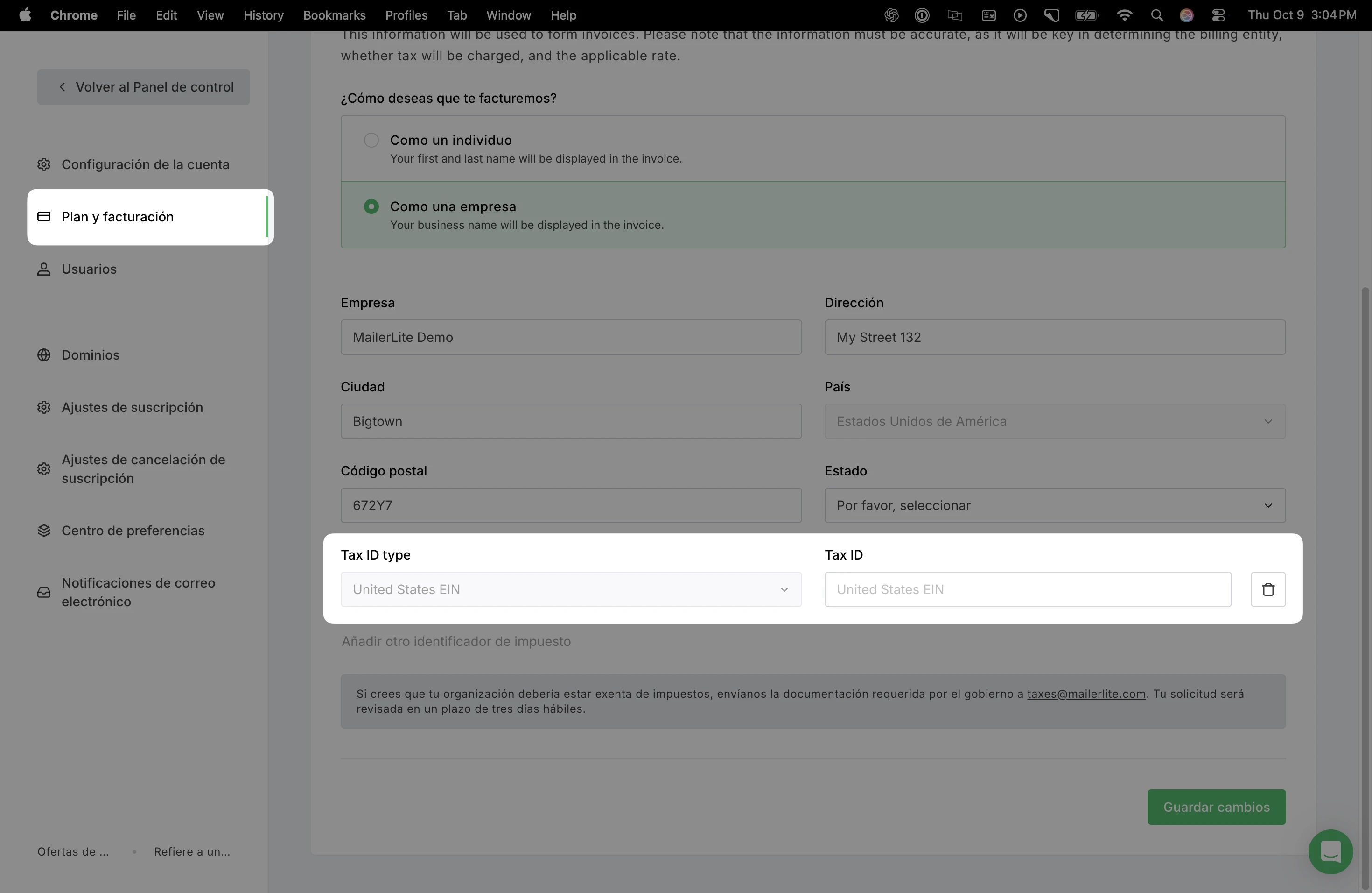 A los clientes de Irlanda (IE) se les cobrará el IVA independientemente de si se proporcionan un número de IVA válido. El IVA se añadirá automáticamente a las facturas de MailerLite.