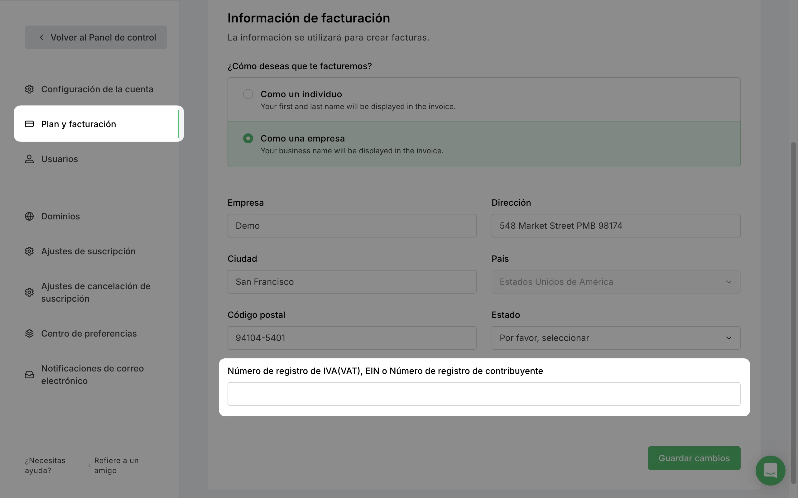 Si no tienes un número de IVA, puedes eliminar el campo de identificación fiscal haciendo clic en el icono de la papelera que aparece a la derecha del campo. Esto te permitirá guardar tu información de facturación y continuar sin un número de identificación fiscal.