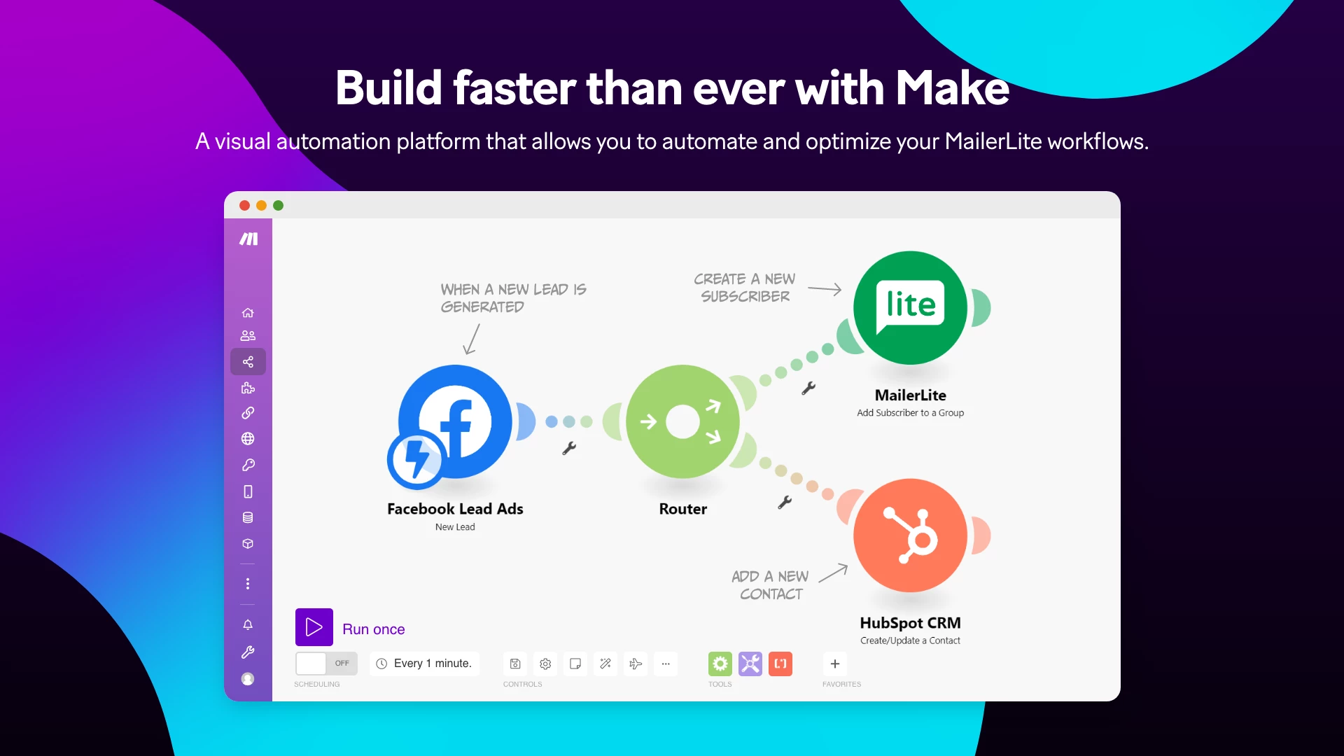Make es una plataforma visual que te permite diseñar, construir y automatizar desde tareas sencillas hasta flujos de trabajo complejos en cuestión de minutos. Con Make, puedes enviar información entre MailerLite y miles de aplicaciones para automatizar tu email marketing. Es rápido y fácil de usar, visualmente intuitivo y no requiere conocimientos de programación.