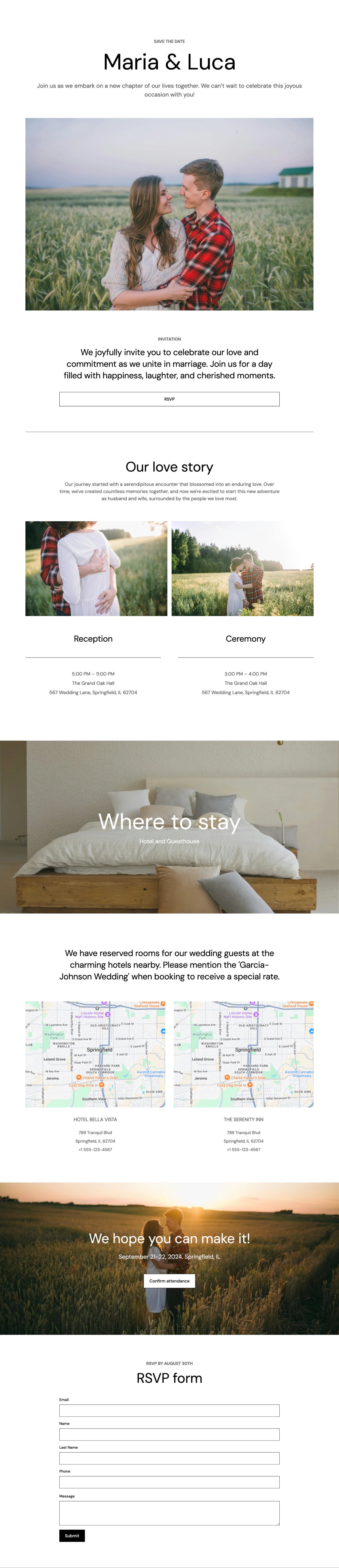 Utiliza el intuitivo editor de landing page para crear secciones dedicadas a contar los detalles de la boda, el banquete y la lista de regalos. Incluye fotos, el programa del día y un formulario de confirmación de asistencia en elegantes bloques de contenido. ¡Crea una cuenta MailerLite para publicar tu landing page de boda hoy mismo!