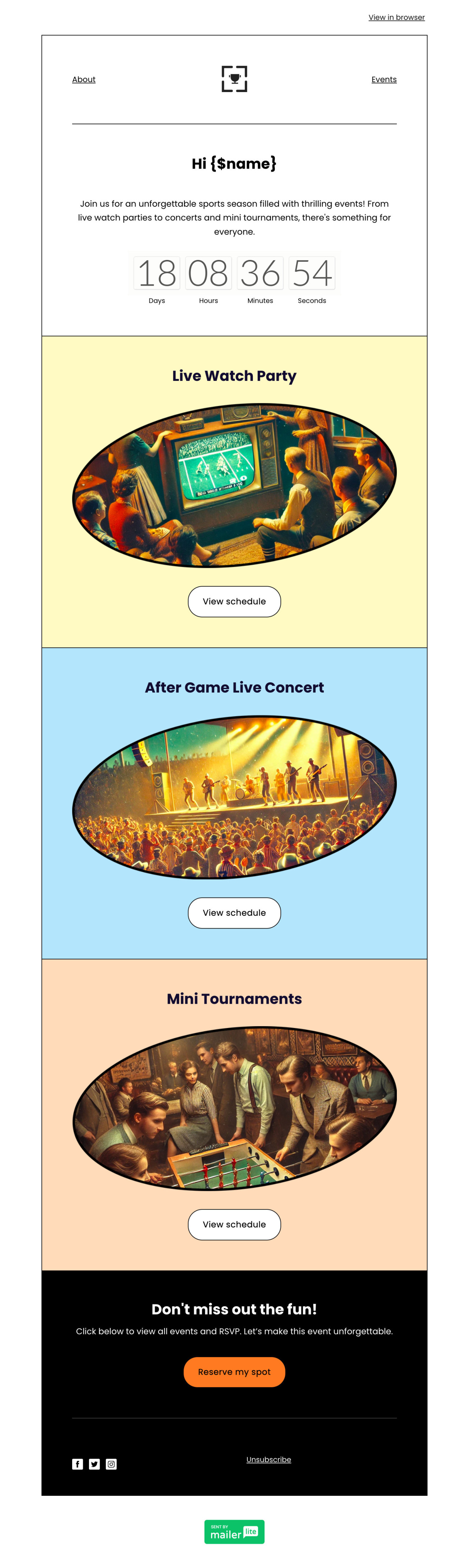 Mira la plantilla de newsletter de evento en vivo. Navega por nuestra galería de plantillas de newsletters, inspírate y comienza hoy a crear el tuyo MailerLite.