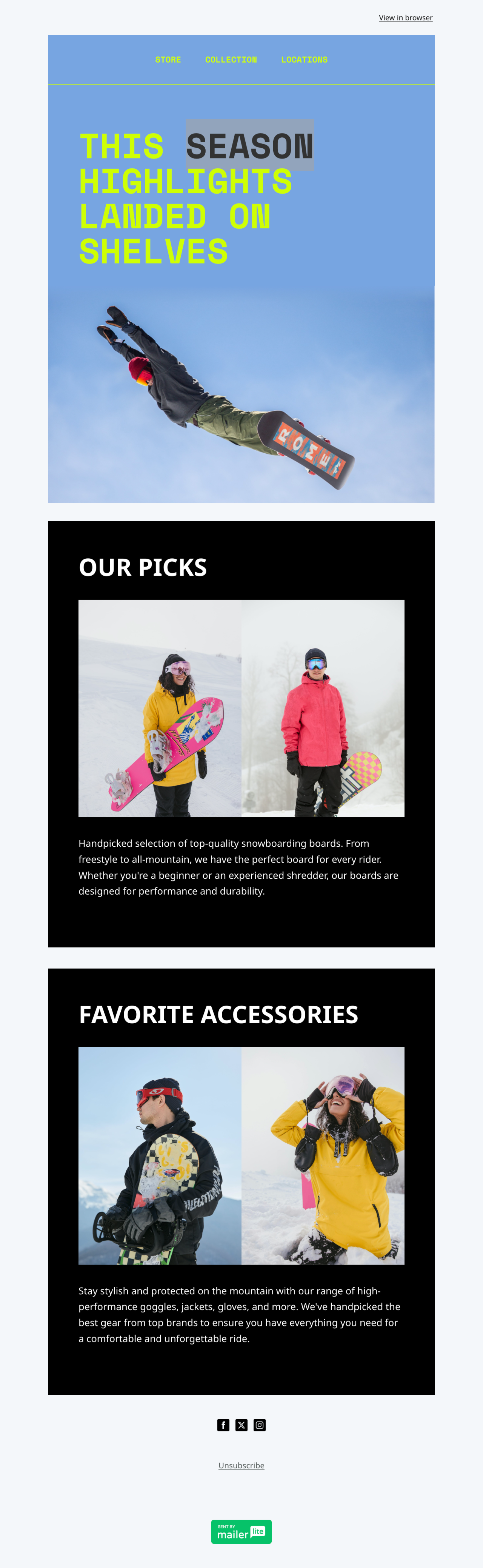 Mira la plantilla de newsletter de equipo de invierno. Navega por nuestra galería de plantillas de newsletters, inspírate y comienza hoy a crear el tuyo MailerLite.