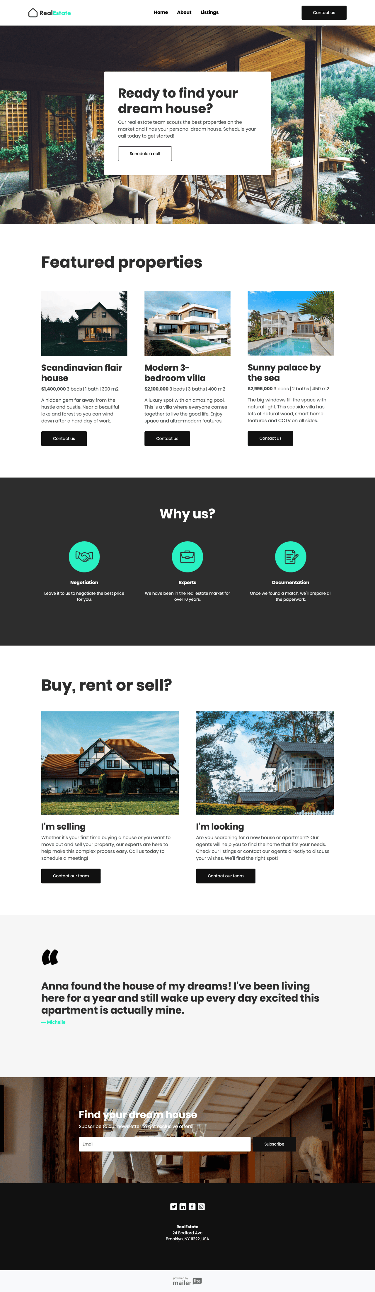 Lleva tu negocio de bienes raíces al siguiente nivel con nuestra plantilla de sitio web inmobiliario personalizable. Destaca tus mejores propiedades con el bloque de propiedades destacadas. Utiliza la página de información predefinida para generar confianza entre compradores y vendedores proporcionando más detalles sobre tu negocio. Potencia tu marketing inmobiliario por correo electrónico con un formulario integrado y utiliza los enlaces a redes sociales y la página de contacto para que los leads se pongan en contacto contigo. Regístrate en MailerLite para crear tu sitio web inmobiliario hoy mismo.