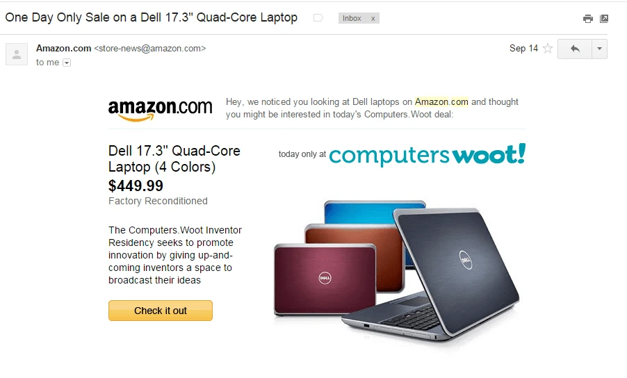 Amazon es considerado el pionero de los correos electrónicos personalizados porque pueden usar tu historial de compras para crear contenido que sea único y relevante para ti. A menudo envían correos electrónicos de carrito de compras abandonados, o se comunican contigo cuando ven que has estado mirando un determinado producto (como en este correo electrónico a continuación).
