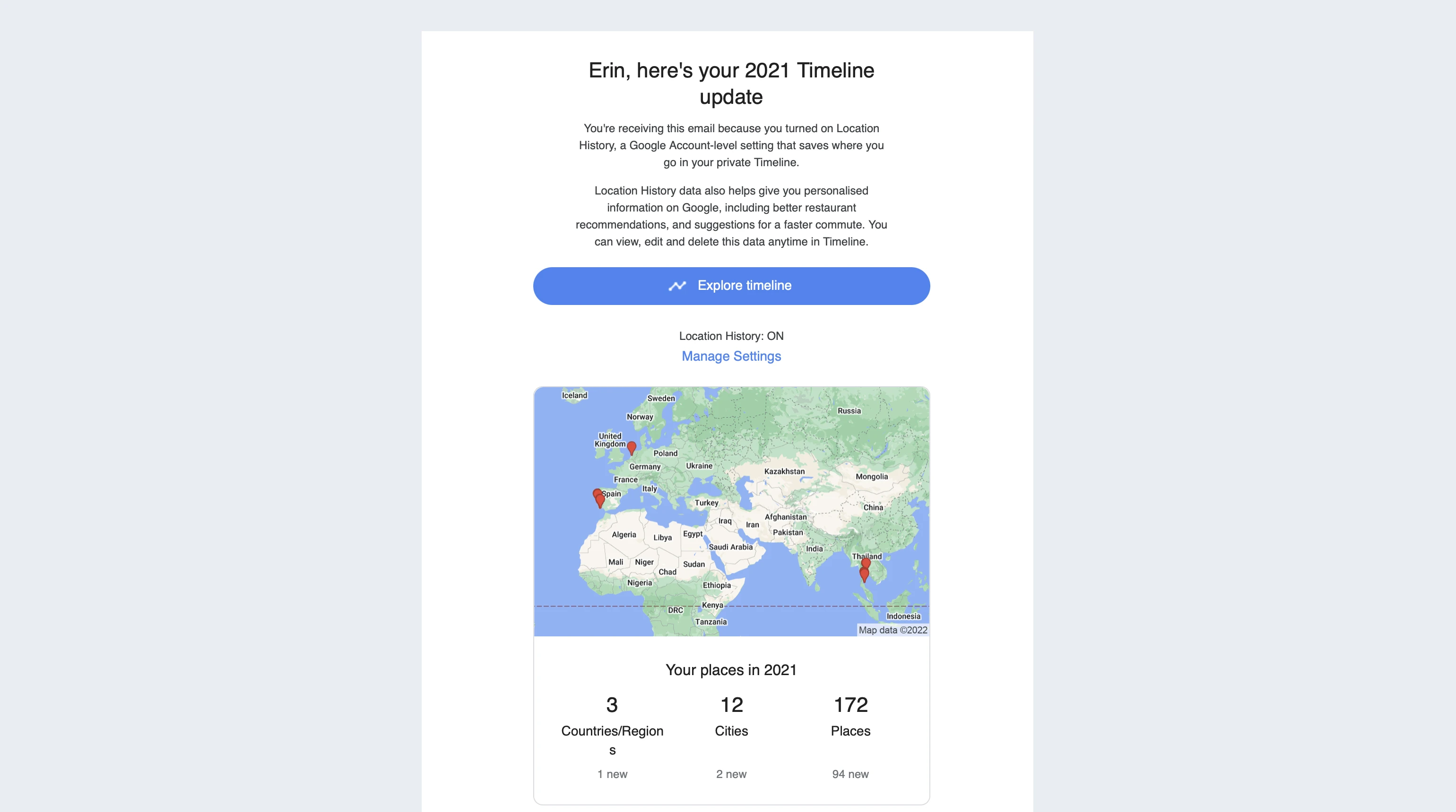 Cuando las personas tienen activado su historial de ubicaciones, Google envía un newsletter anual que muestra los lugares que visitaron y dónde pasaron la mayor parte de su tiempo. ¡Una buena manera para que las personas miren hacia atrás y vean qué tan lejos han llegado (literalmente)!