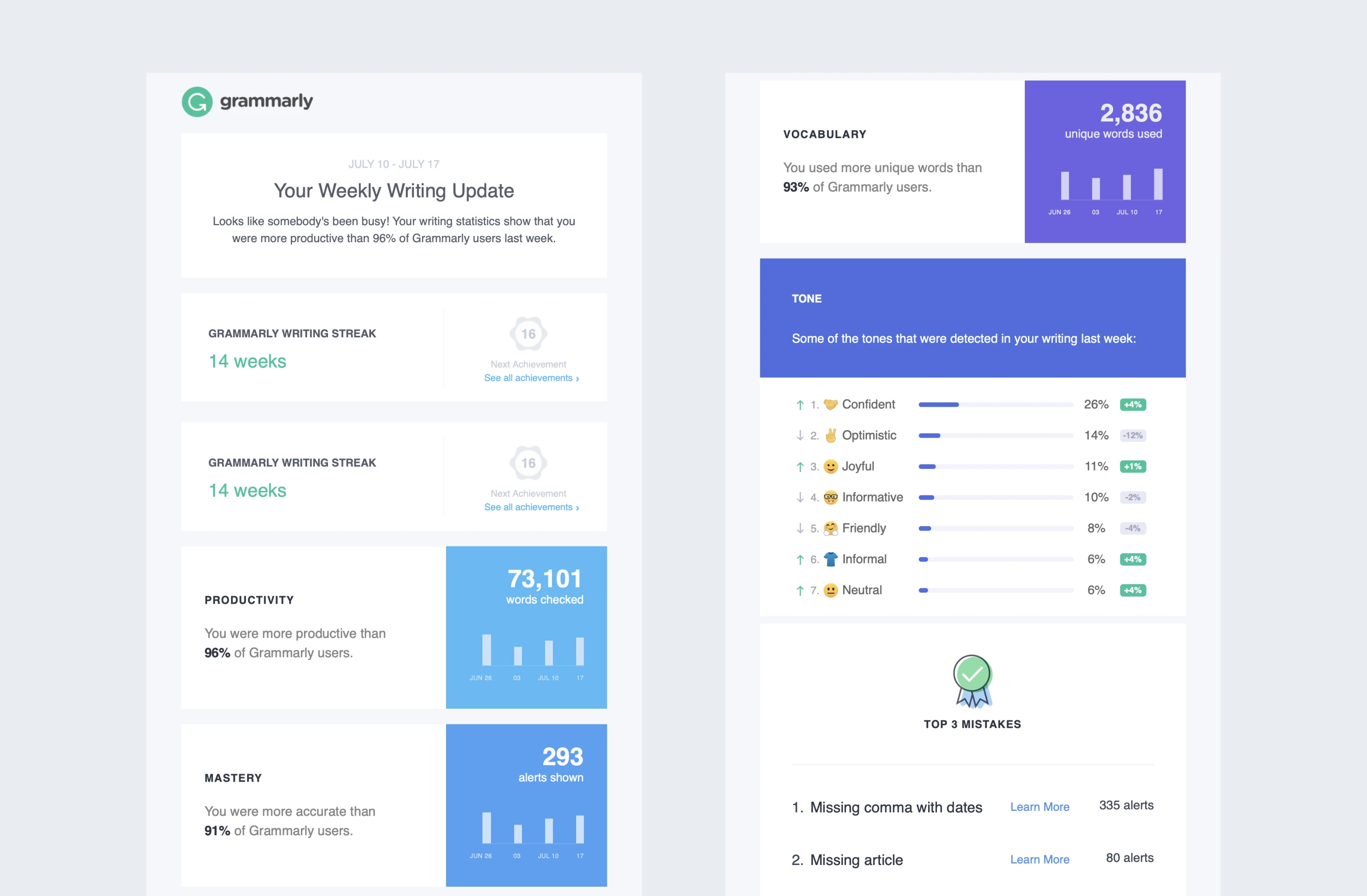 Grammarly proporciona a los usuarios métricas semanales que proporcionan información sobre su escritura. Esto incluye estadísticas útiles como los errores más comunes y los tonos utilizados que ayudan a los usuarios a ajustar su escritura para ayudar a cumplir sus objetivos.