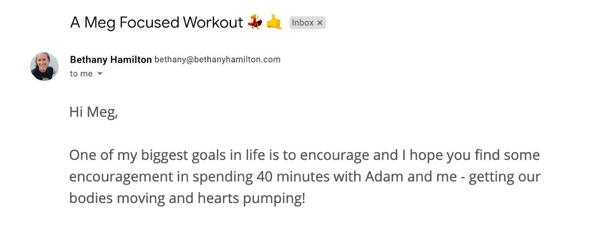 Echa un vistazo a esta campaña de correo electrónico de Bethany Hamilton, una surfista profesional estadounidense. Al personalizar la línea de asunto y el mensaje de apertura, instantáneamente haces que el contenido del correo electrónico sea más relevante y dirigido al suscriptor individual.