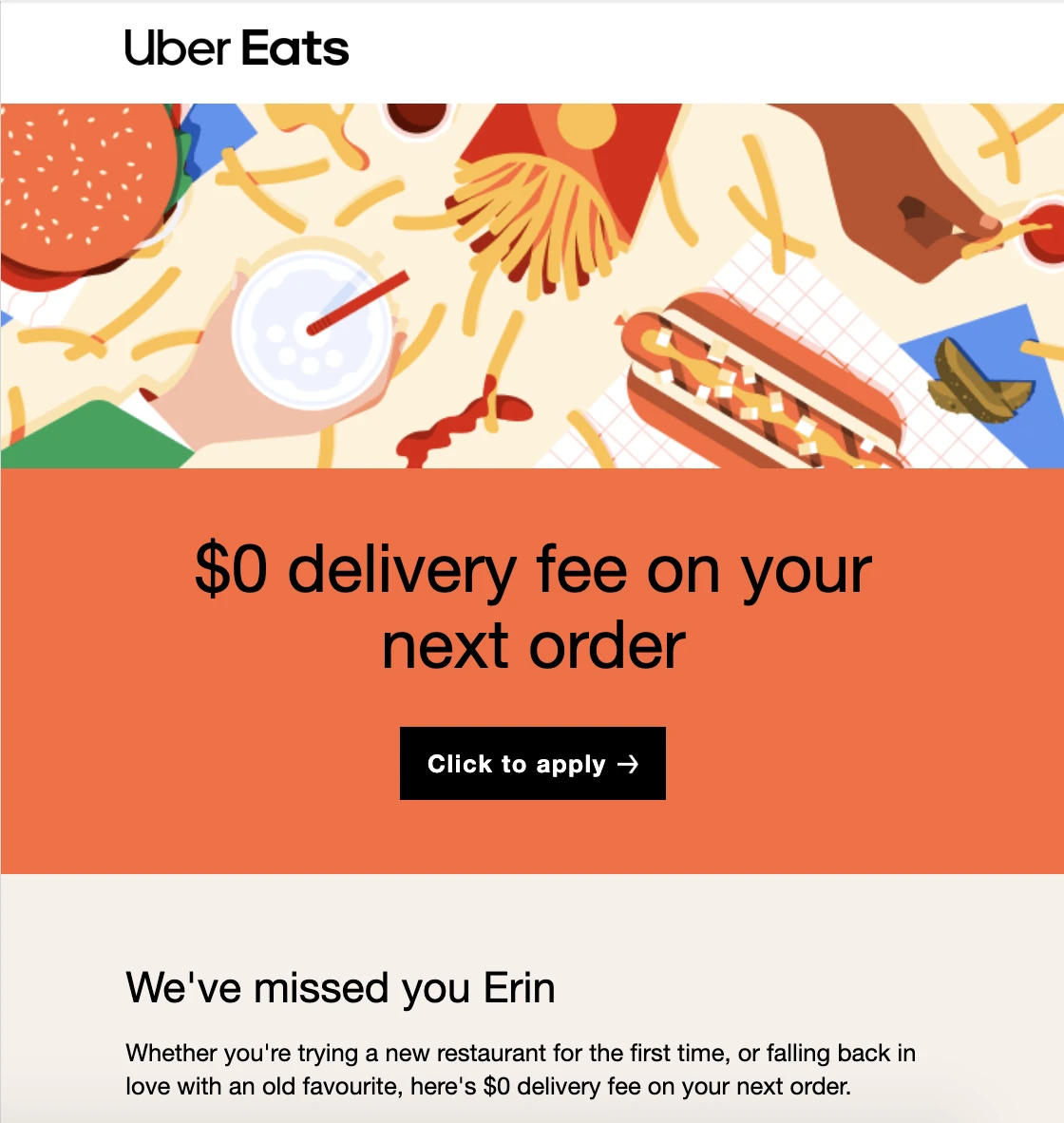 En este correo electrónico personalizado de re-engagement, Uber Eats segmentó a sus suscriptores y se dirigió a los que no habían hecho una compra en mucho tiempo: "¡Te hemos extrañado Erin!". El contenido es relevante para aquellos que anteriormente usaron su servicio, pero no lo han estado usando con tanta frecuencia, y ofrece un incentivo para realizar otra compra: "$0 en gastos de envío en tu próximo pedido"