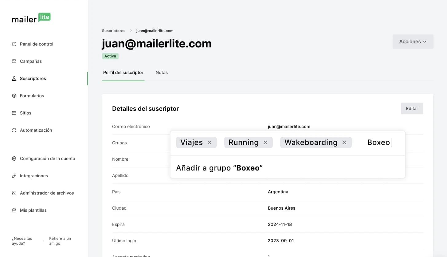 Los grupos de interés (o etiquetas) te permiten agregar etiquetas especiales a tus suscriptores y agruparlos en función de sus comportamientos o intereses. Por ejemplo, si tienes una página de salud y bienestar, puedes agrupar a tus suscriptores en función de aquellos que están más interesados en el yoga o aquellos que prefieren cardio. Con la segmentación y la gestión de suscriptores, tus campañas de correo electrónico serán mucho más específicas y personales.