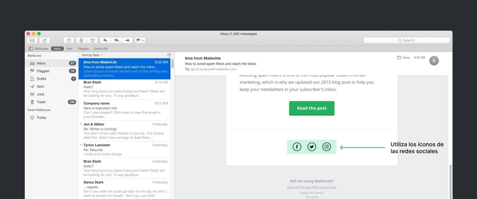 Sigue su ejemplo y mantén a tus suscriptores conectados a las redes sociales de tu marca recordándoles por correo electrónico.