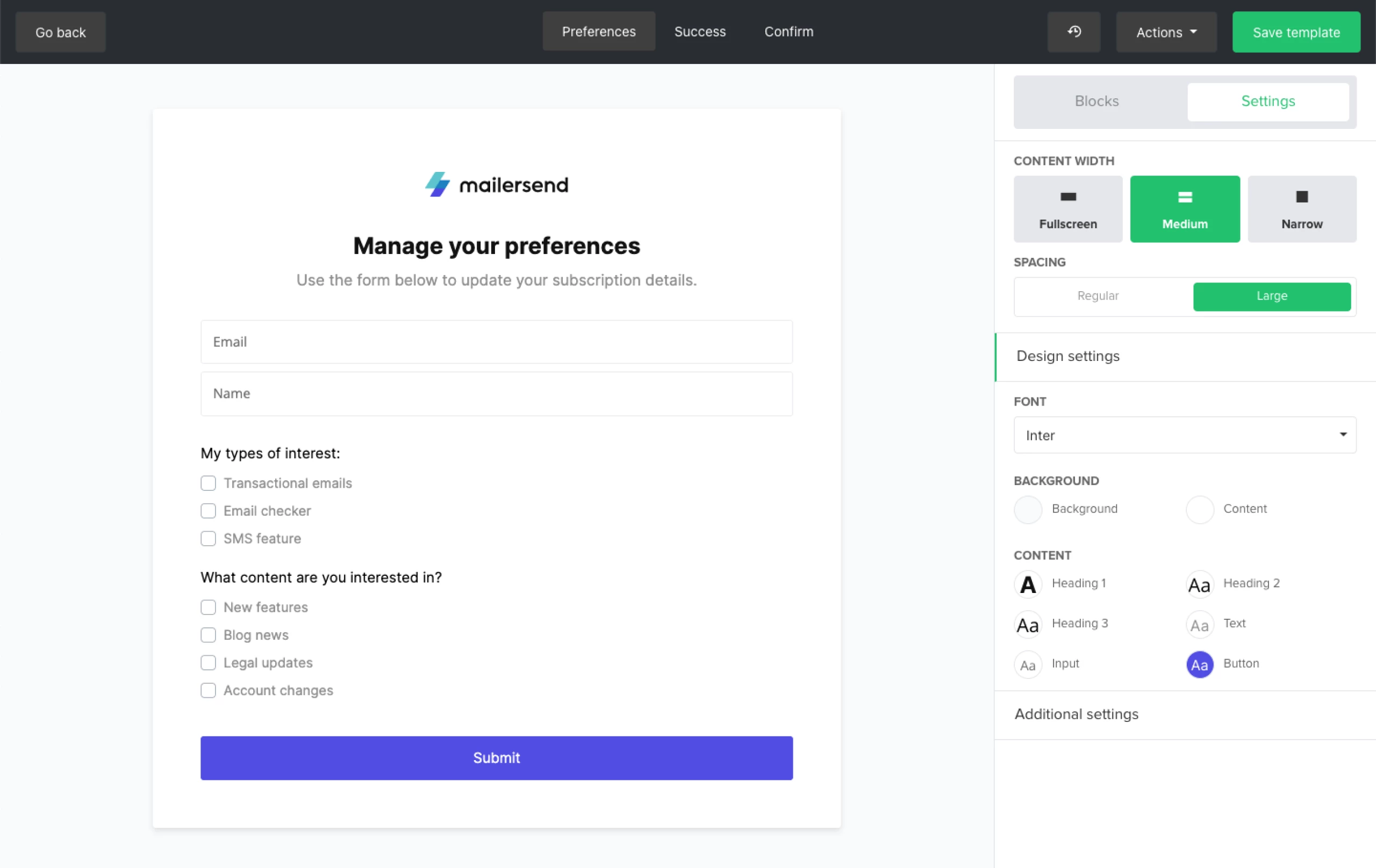 Our preference center builder includes 8 blocks, 3 pages, and loads of design options. You can edit fonts and colors to match your brand and align your domain.Â