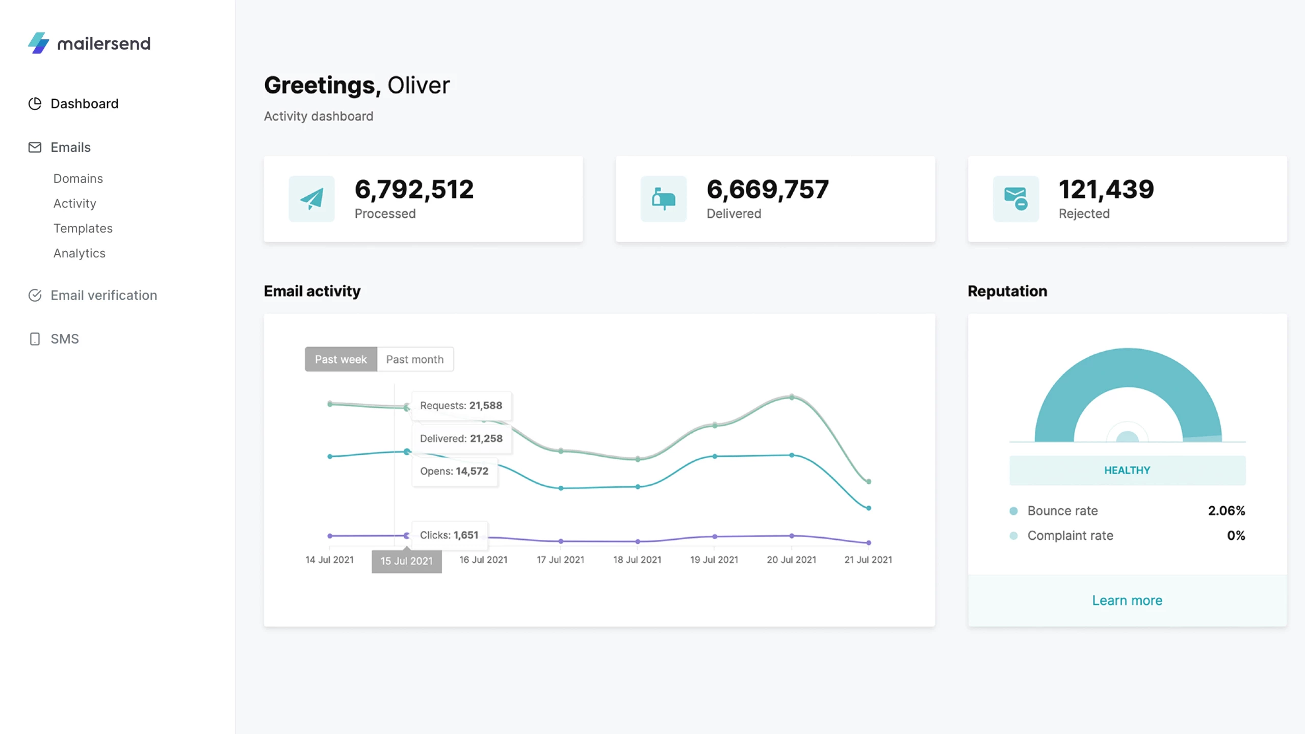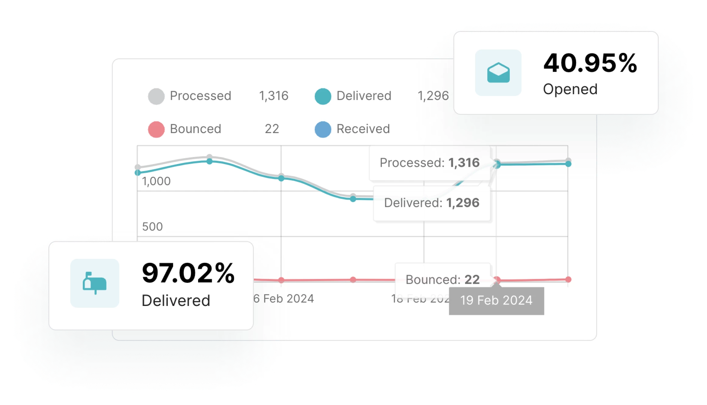 View and monitor sending activity to gain the insights you need to optimize your emails. Webhooks deliver real-time information, while the advanced search tool helps you find emails or recipients quickly.