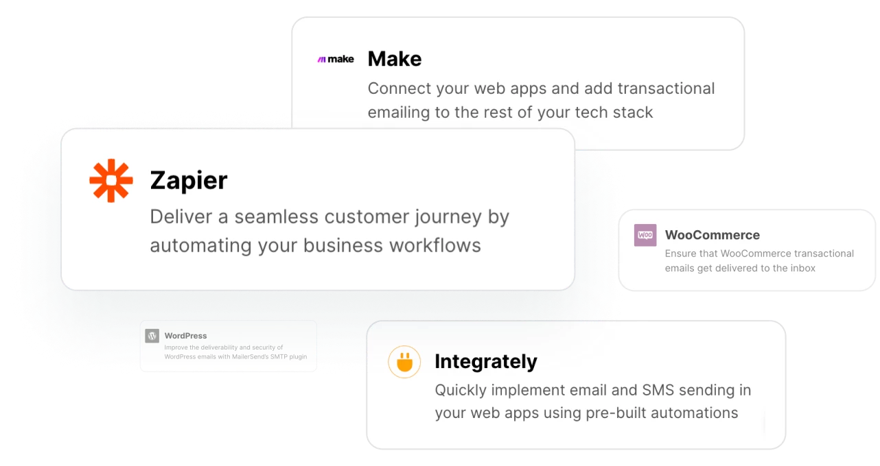 Save time and connect to thousands of other apps using pre-built automations from Zapier, Make and Integrately. Create automated email workflows for timely email delivery without the need for coding.