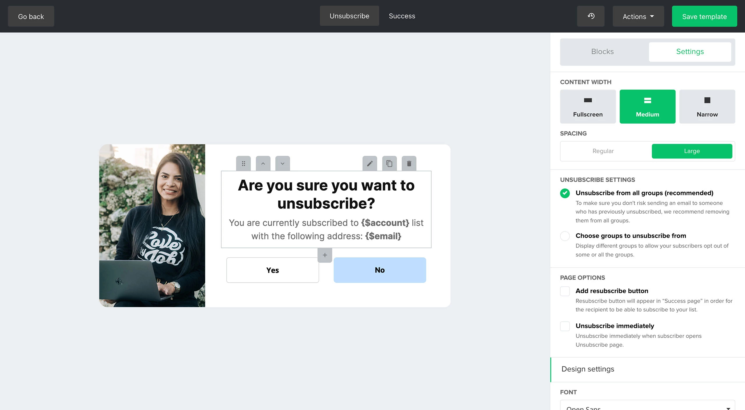 More than just goodbye: Use the unsubscribe page builder to customize the message, encouraging people to connect through other channels, resubscribe, or simply part ways on a positive note.