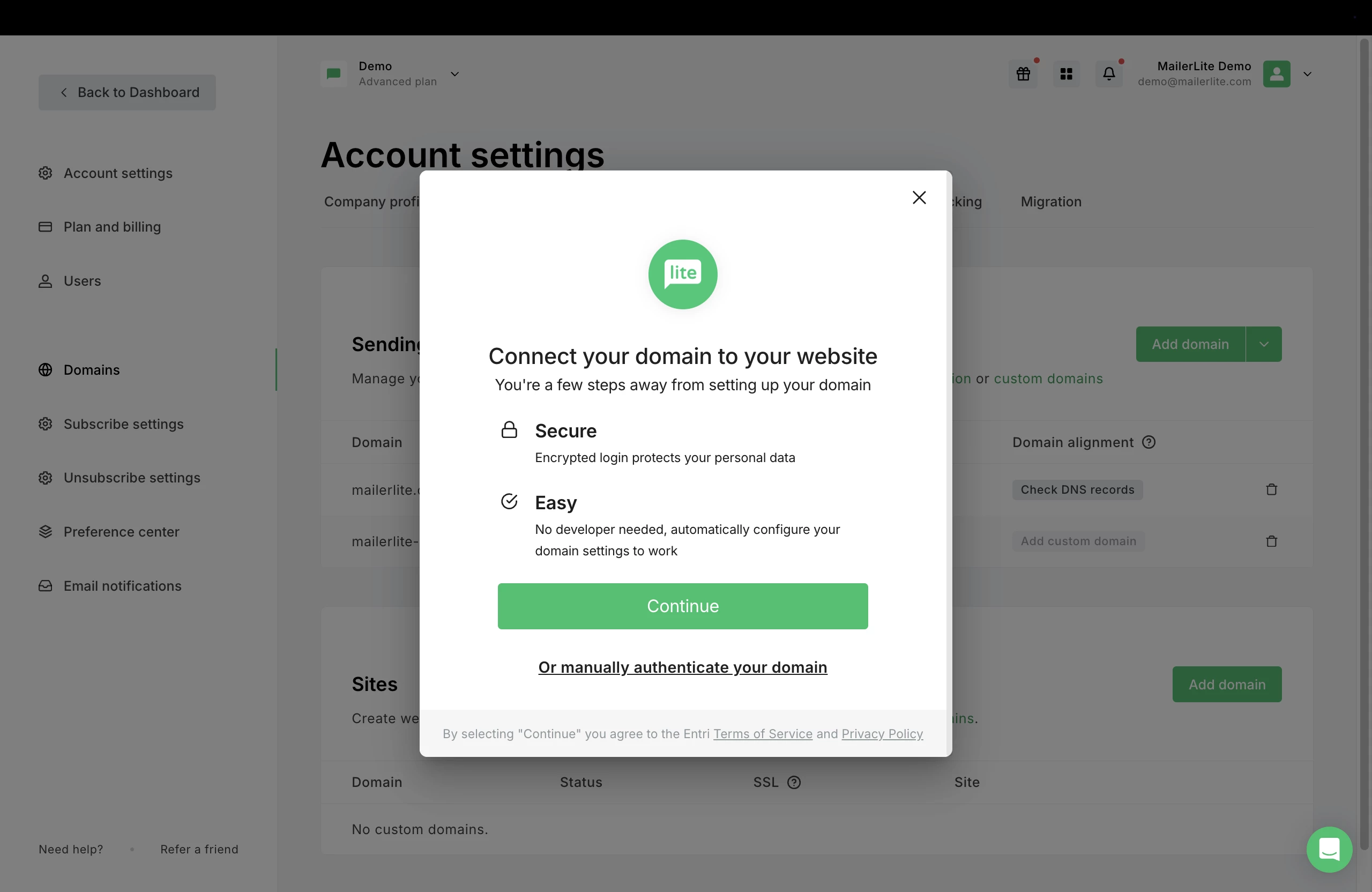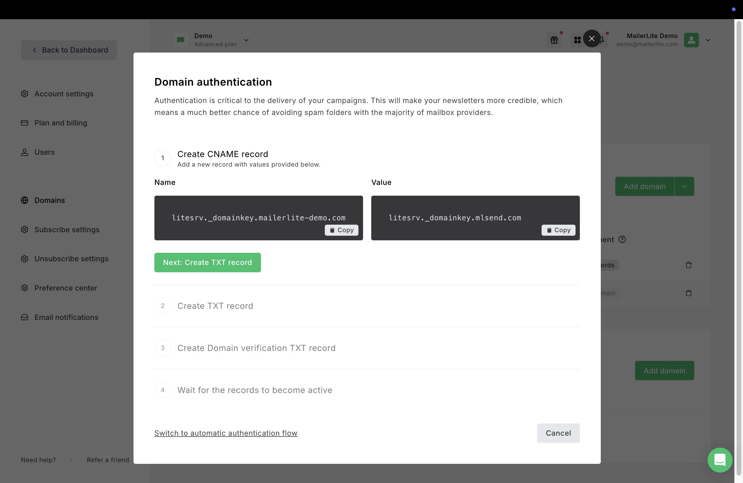 💡 Automatic domain authentication is only available on the new MailerLite.