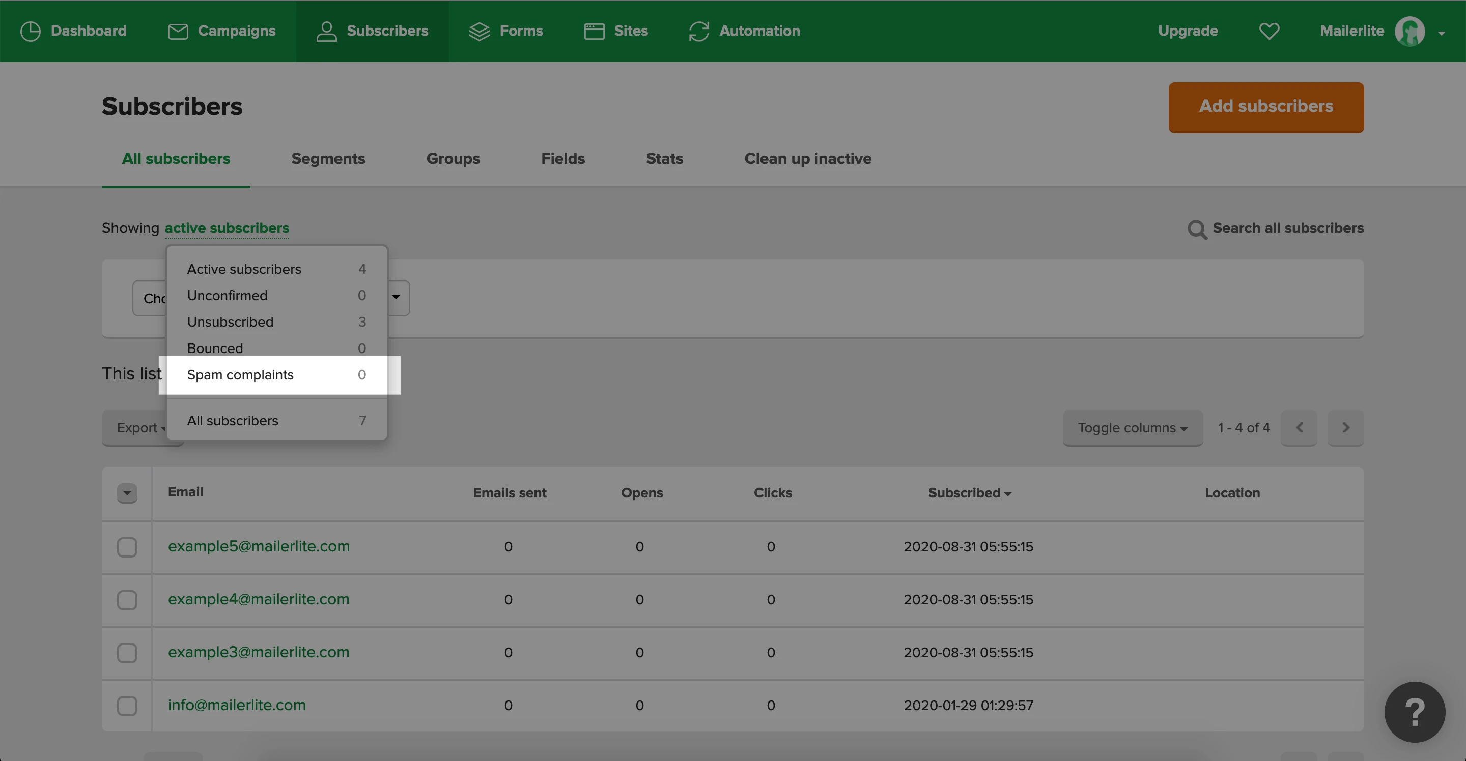 You can locate spam complaints on the Subscribers page by clicking on the dropdown menu on Active subscribers.