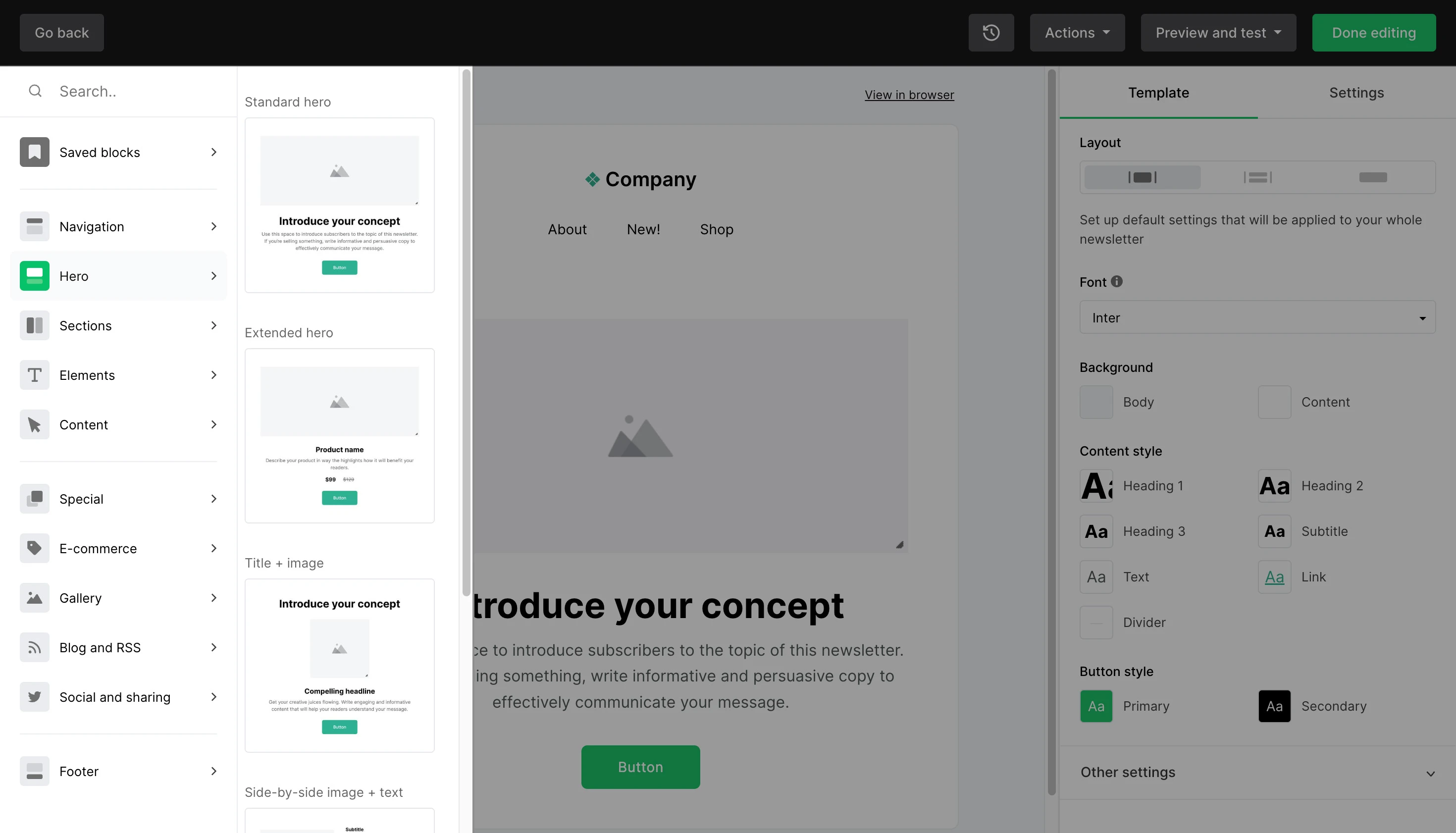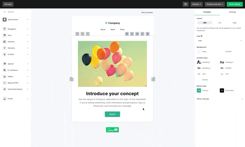 On the right-hand sidebar, you can edit the general settings for the entire newsletter or each specific block when selected.