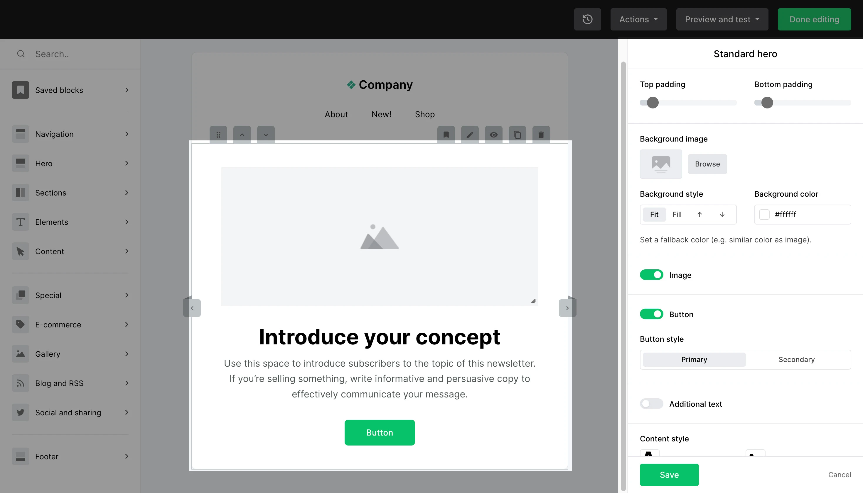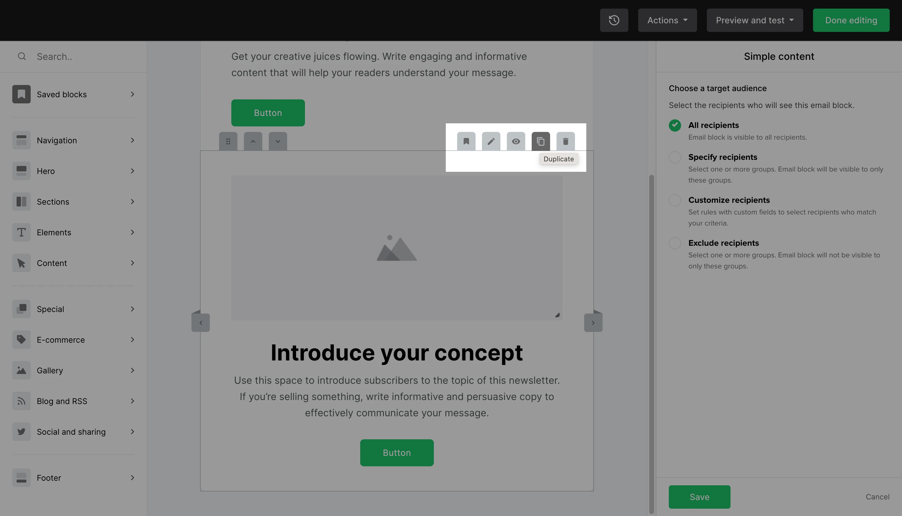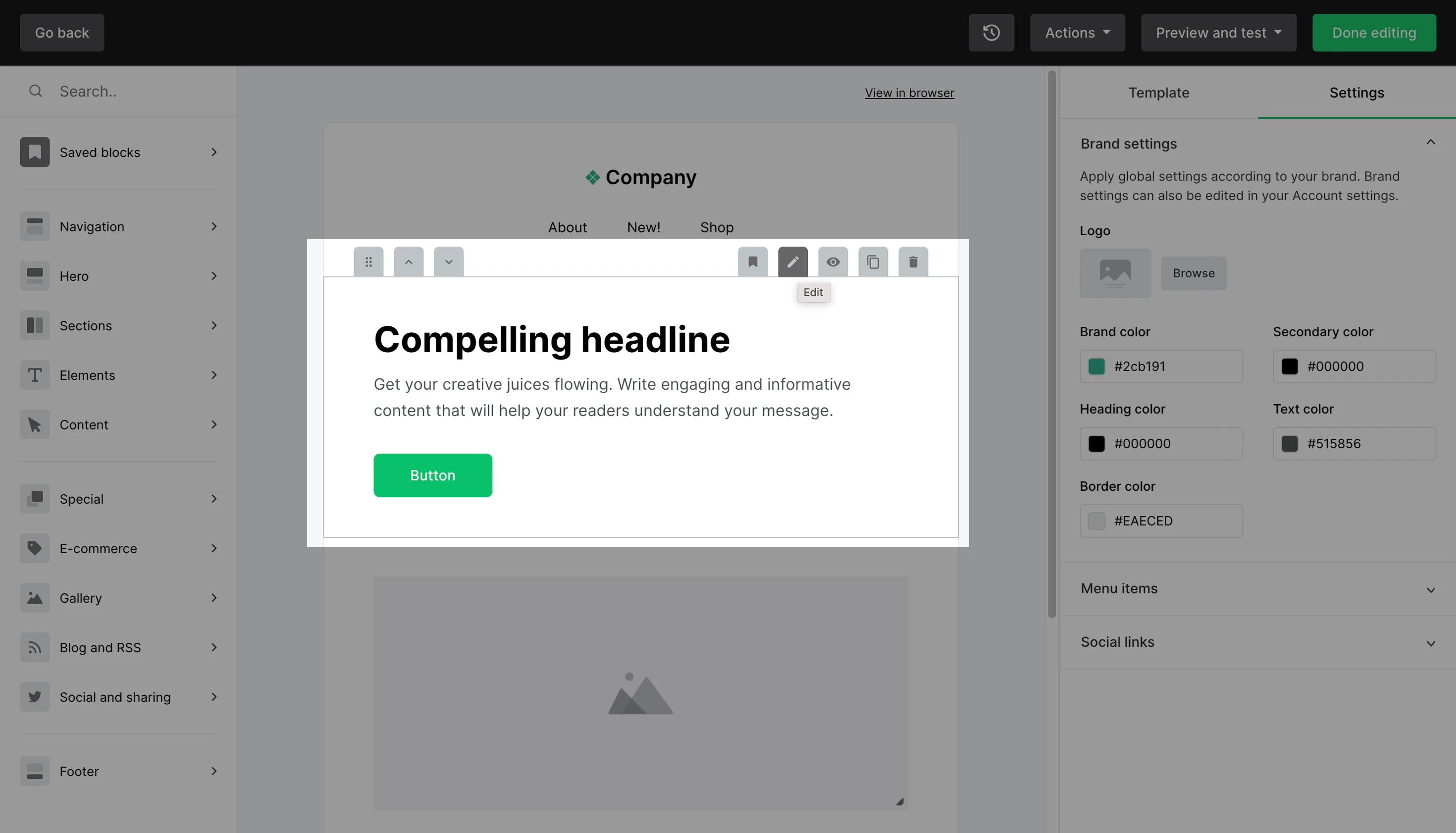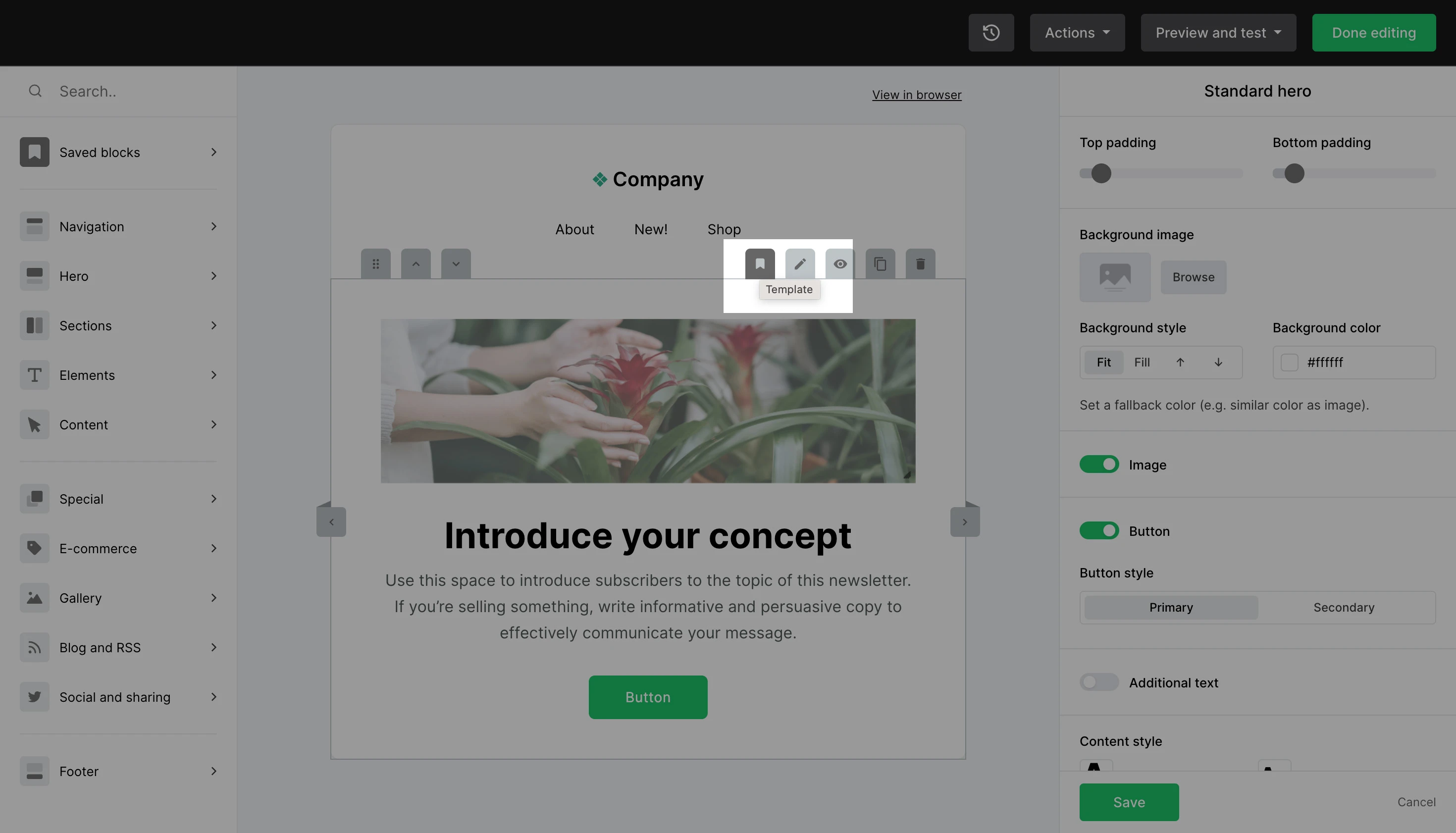 Done editing - Click it when you’re satisfied with the design of your newsletter or to save your unfinished work and come back to it.