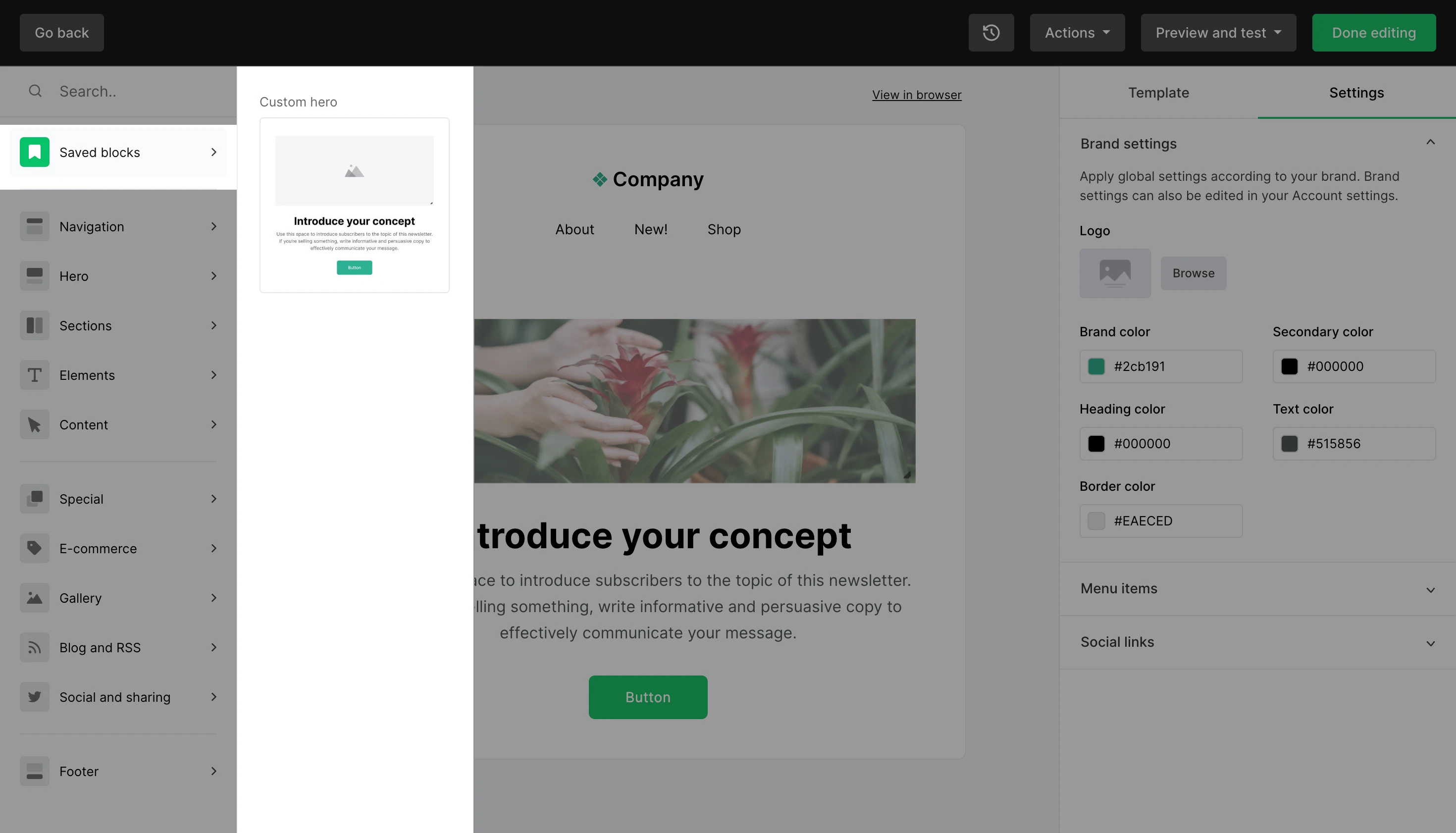 There are numerous blocks on the left-hand sidebar that you can drag and drop into your newsletter and later edit to fit your brand. These blocks are: