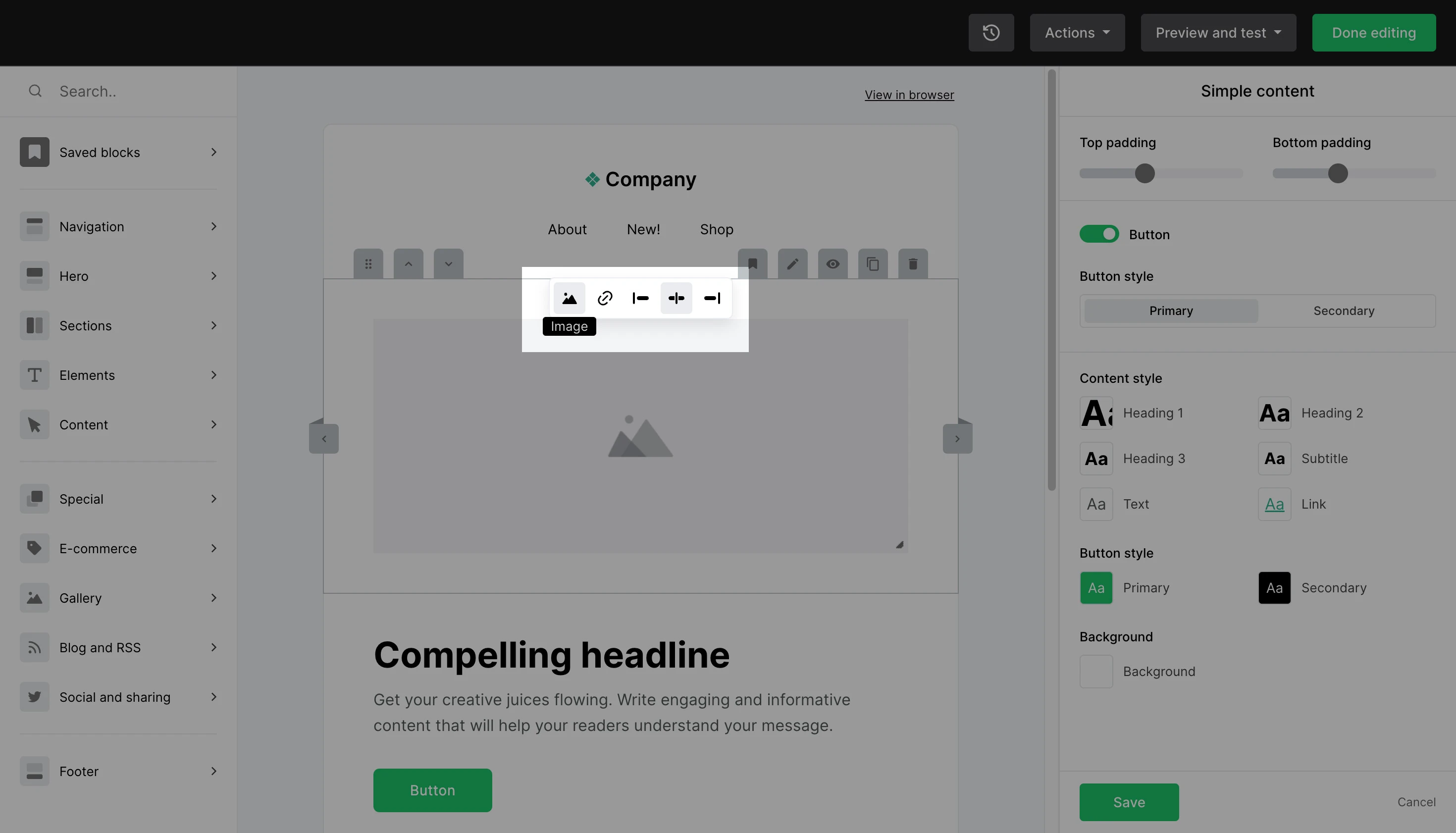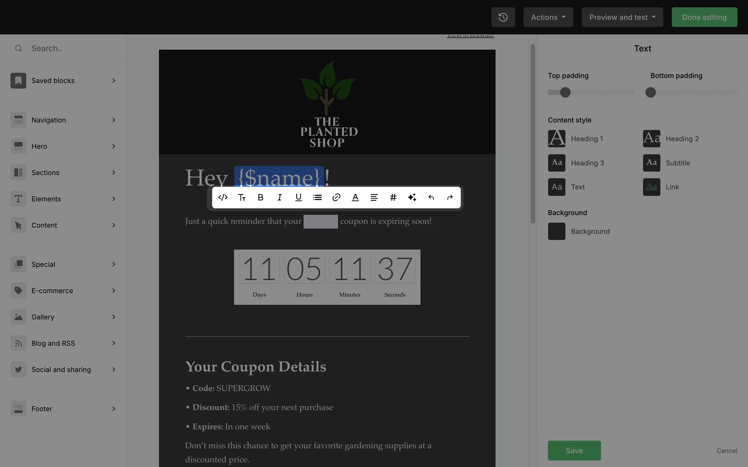 You can add content to your newsletter by dragging and dropping pre-made content blocks, which you can edit on the right-hand sidebar. To add your email copy, simply click on some text and start typing! Highlight specific text to access editing features.
