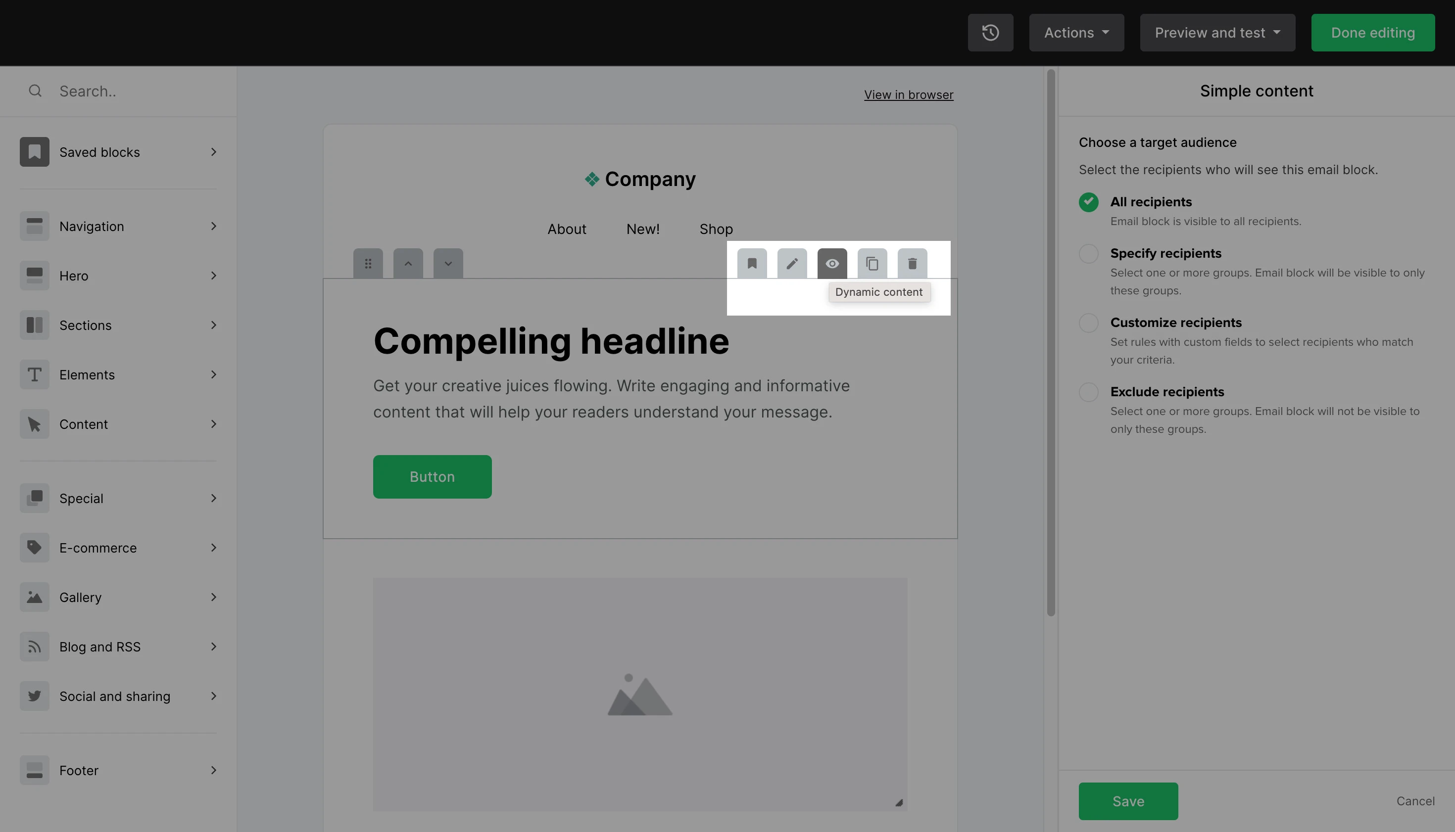 Anyone can become a professional email designer with our upgraded Drag & drop editor. Just choose a block, position it, then fill in the blanks and edit seamlessly–no coding skills needed!