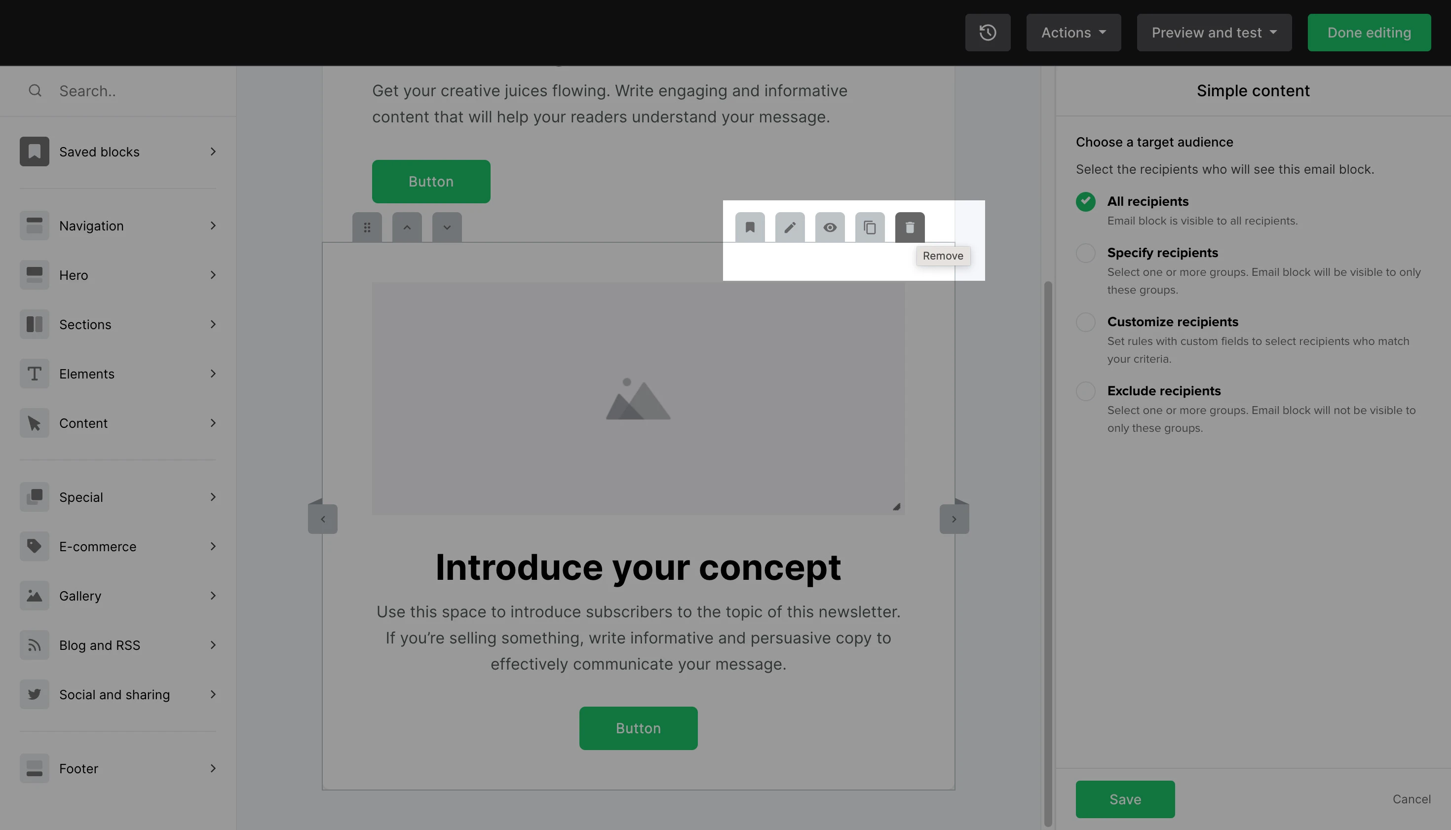 Hover over a block and click on the trash icon to remove it from your newsletter.