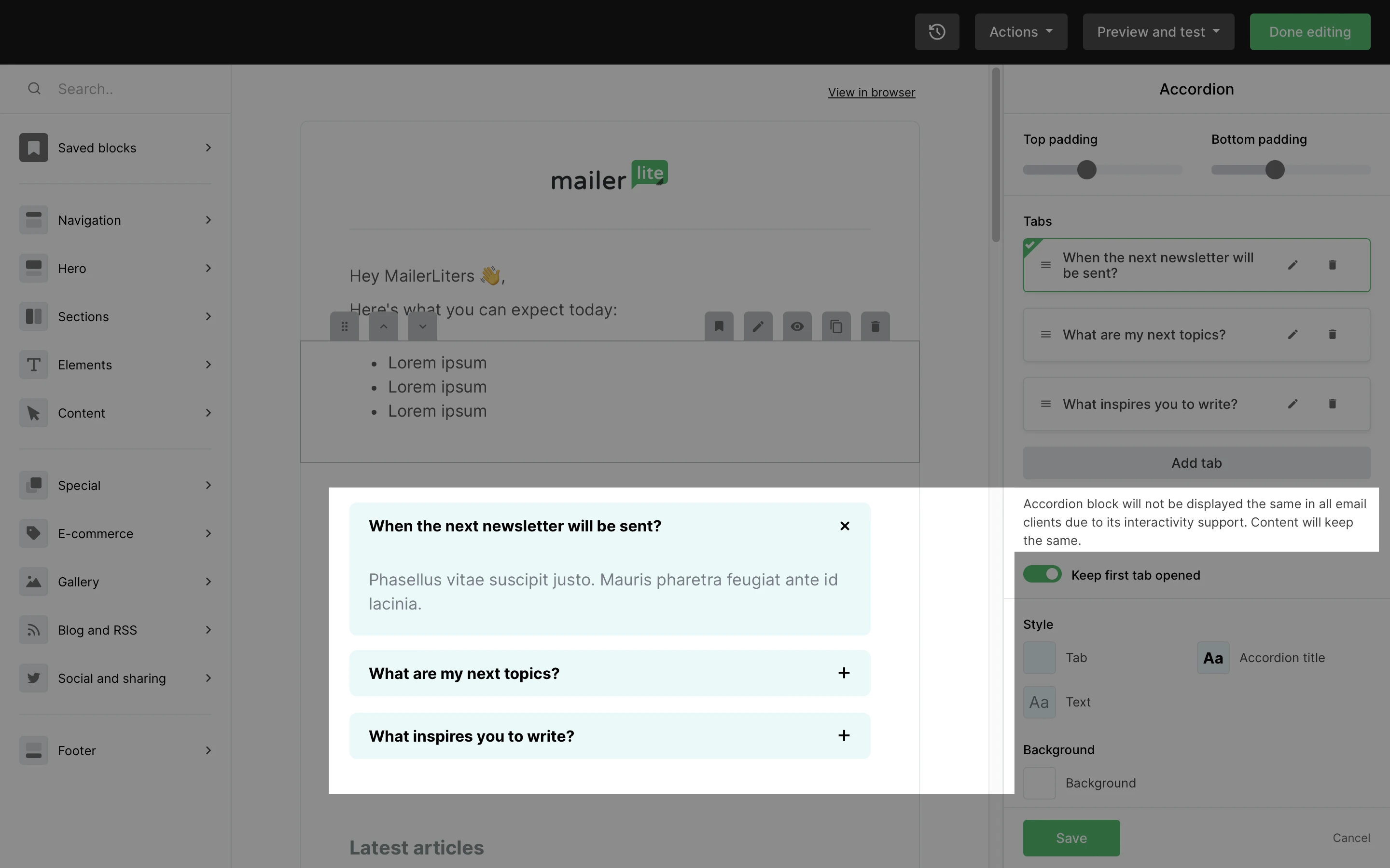 Some interactive blocks such as the Accordion block and the Carousel block in the Drag & Drop editor do not display on all email clients. You can see the following disclaimer within the block settings in the editor.
