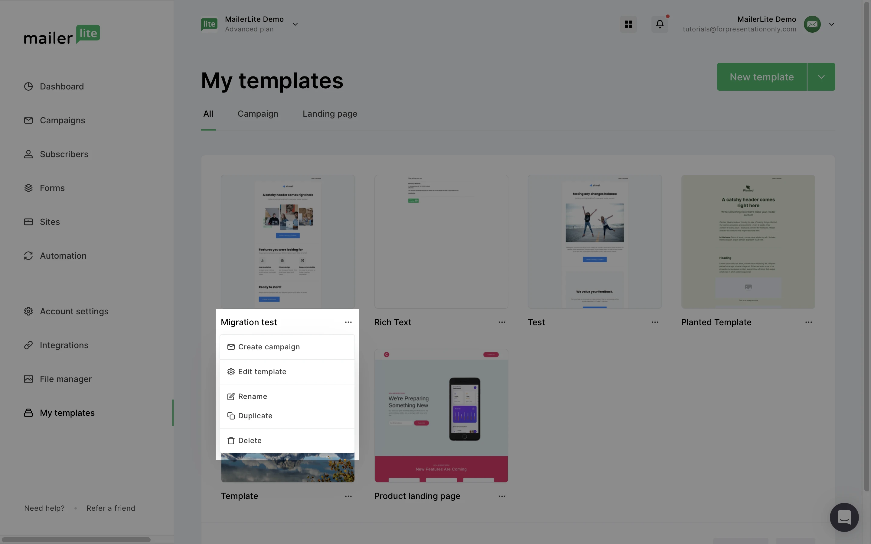 Click the more icon on your template to create a new campaign from it. You can also click the more icon to edit, rename, duplicate or delete your template.