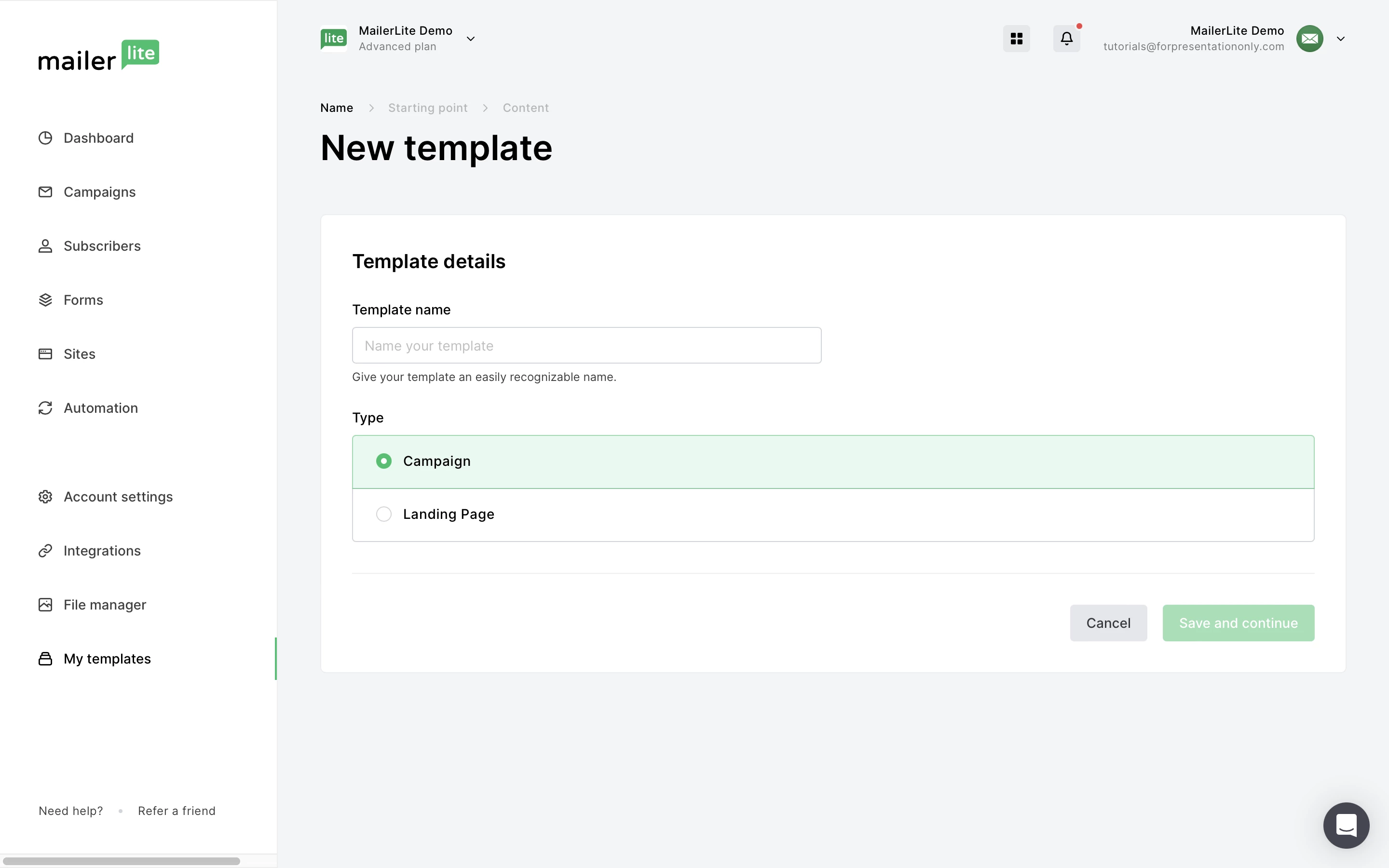 Name your new template and select the template type: Campaign.