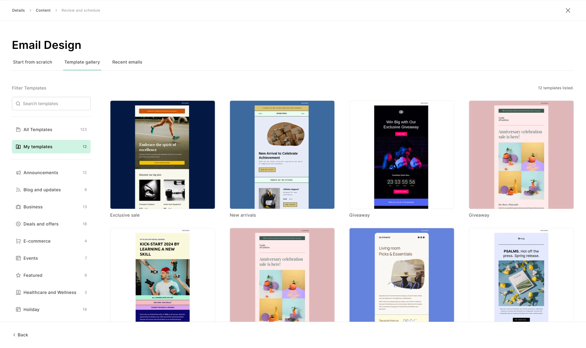 Looking for a particular type of campaign, such as a holiday or an event? Filter pre-designed templates by category to see templates relevant to your campaign.