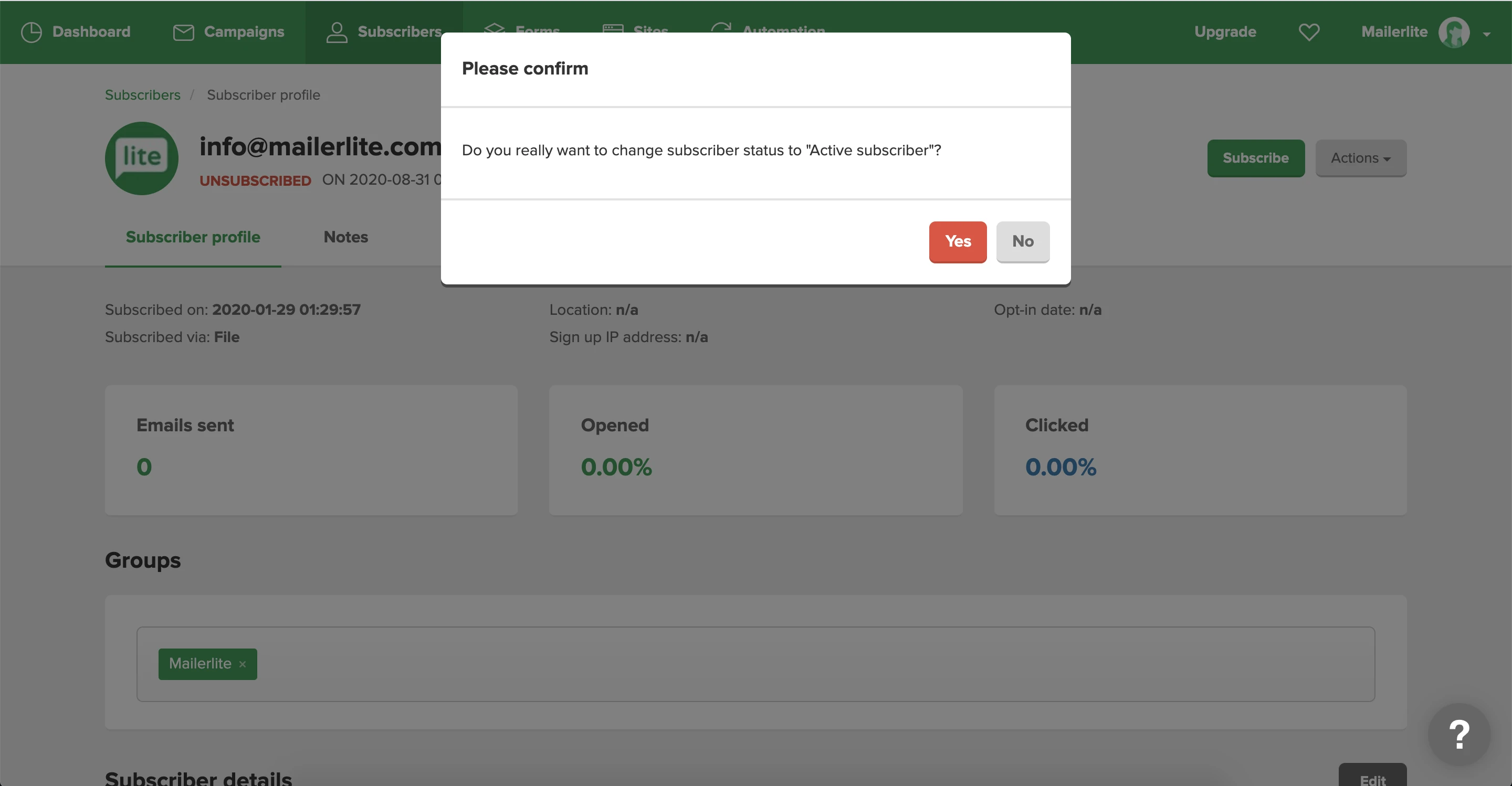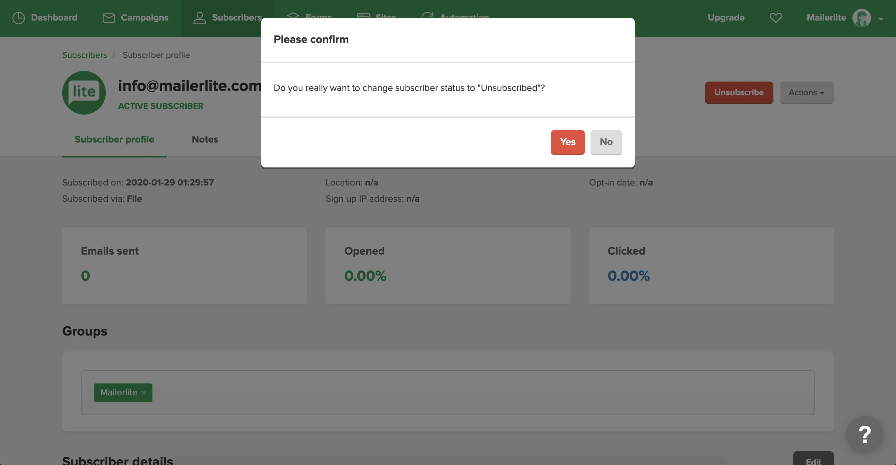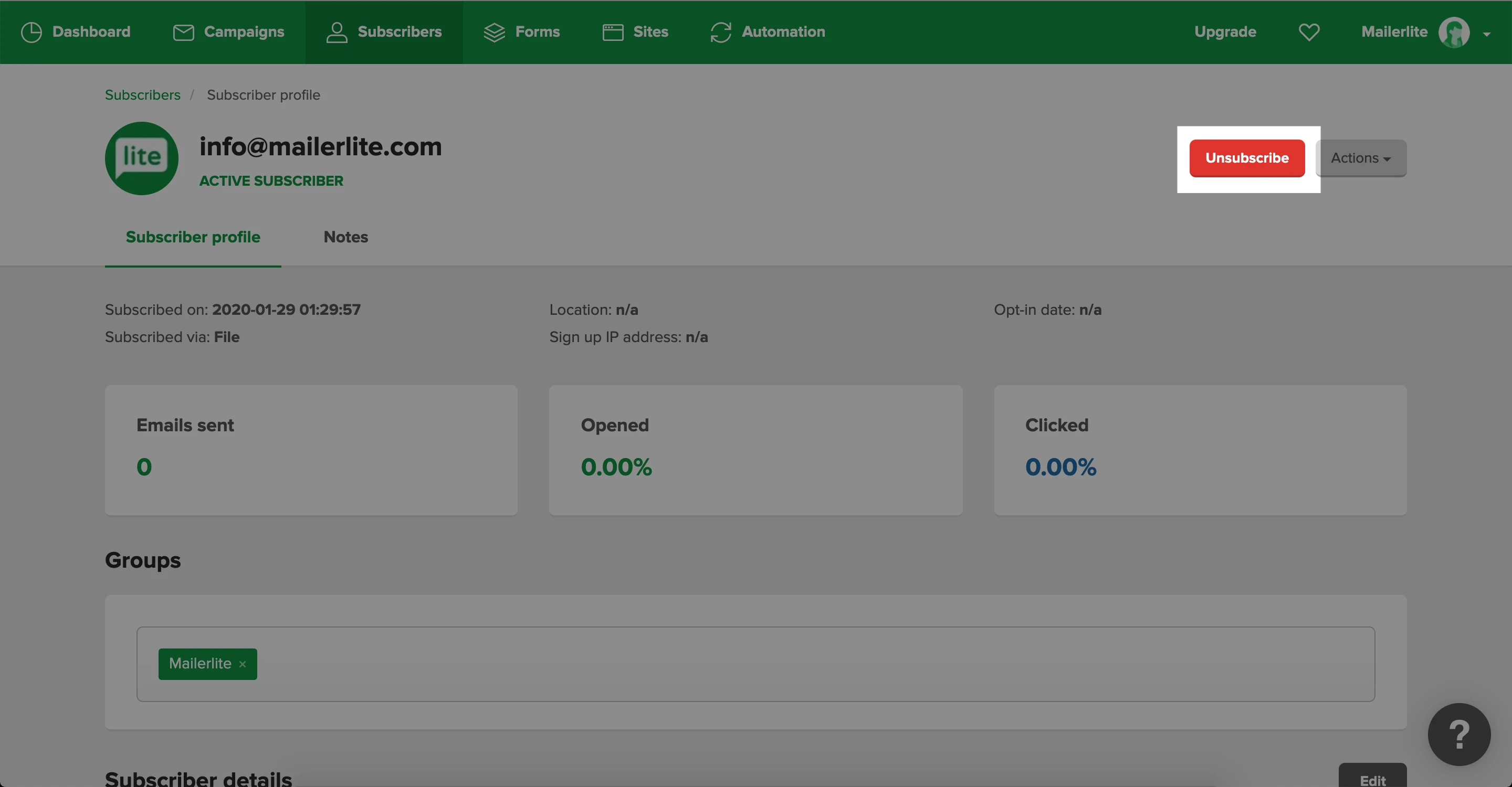 That’s it! The subscriber is now moved to Unsubscribed and newsletters won’t be sent to that email address anymore.
