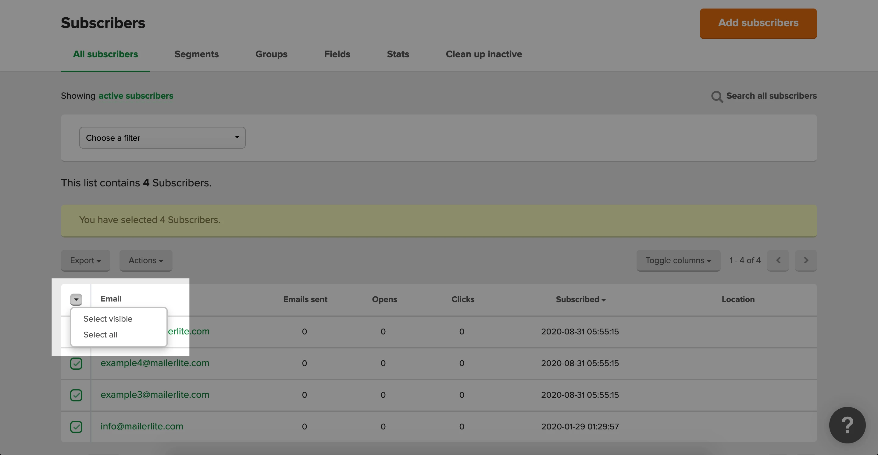 Note: If you click Select visible, only subscribers visible on that page will be selected.
