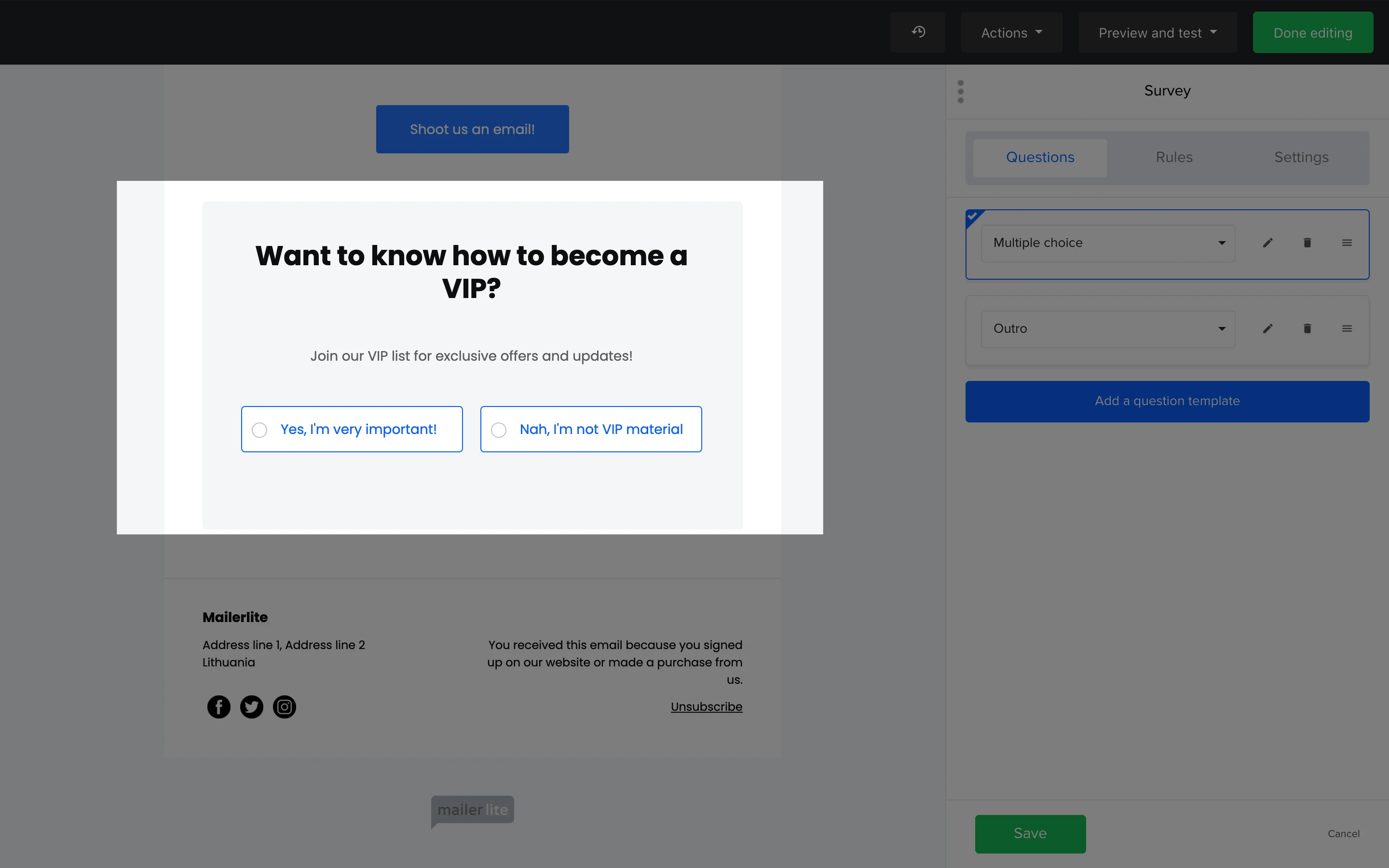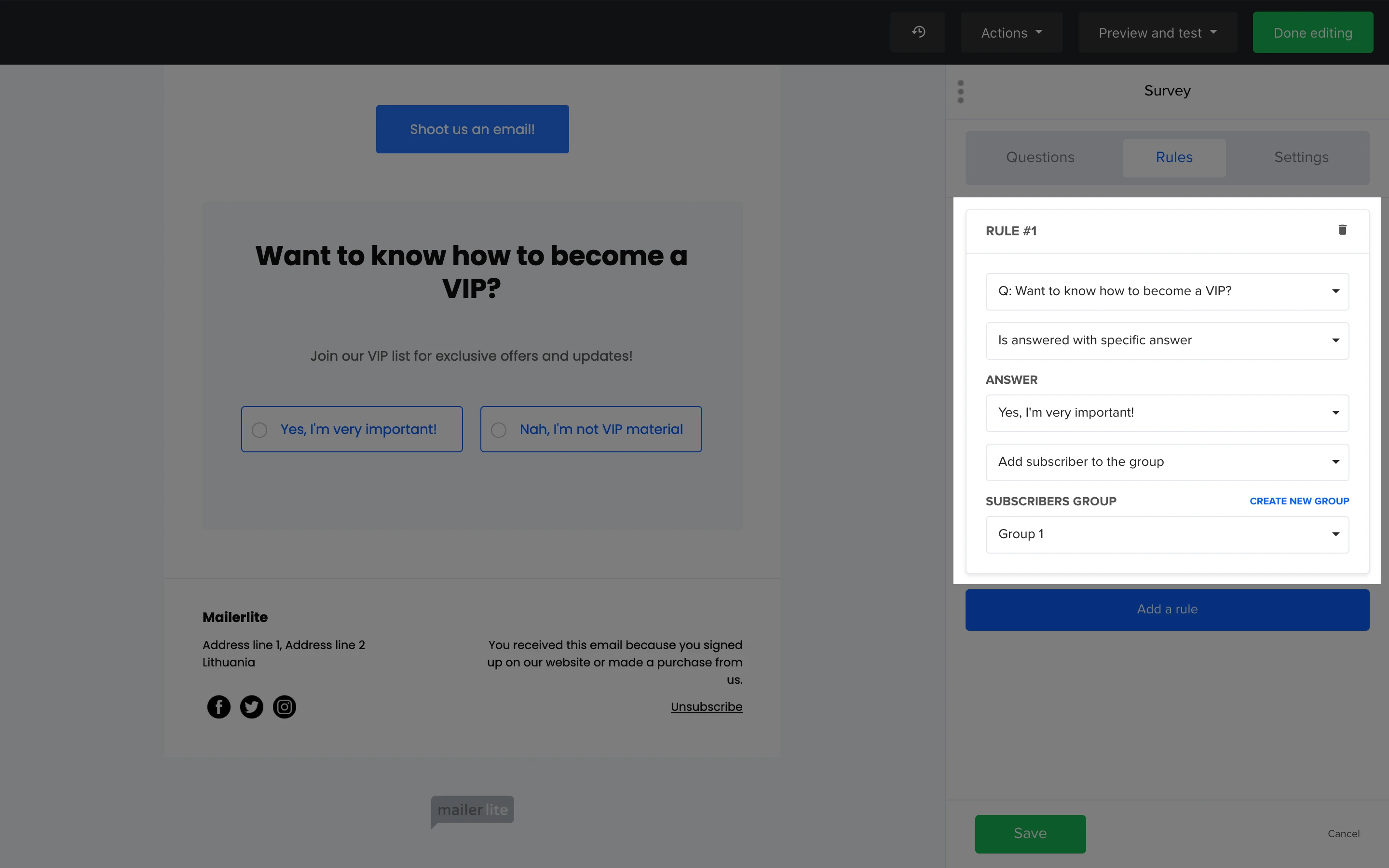 Note: If your survey is adding subscribers to a group, consider using that group as a trigger for an automation workflow to send automated emails to subscribers who join that group.