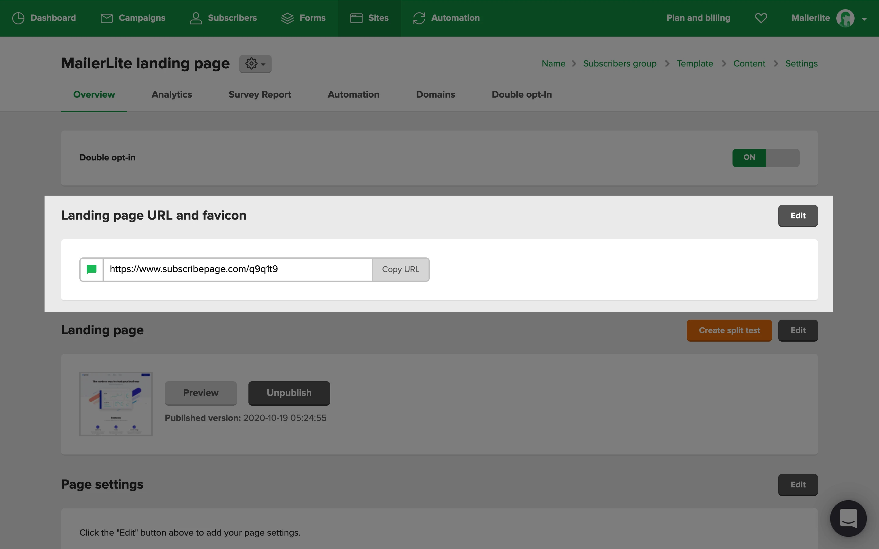 To find the form or landing page URL to add to your button block, click the title Overview button on your landing page or embedded form, copy the URL on the right-hand side and paste it into your button block.