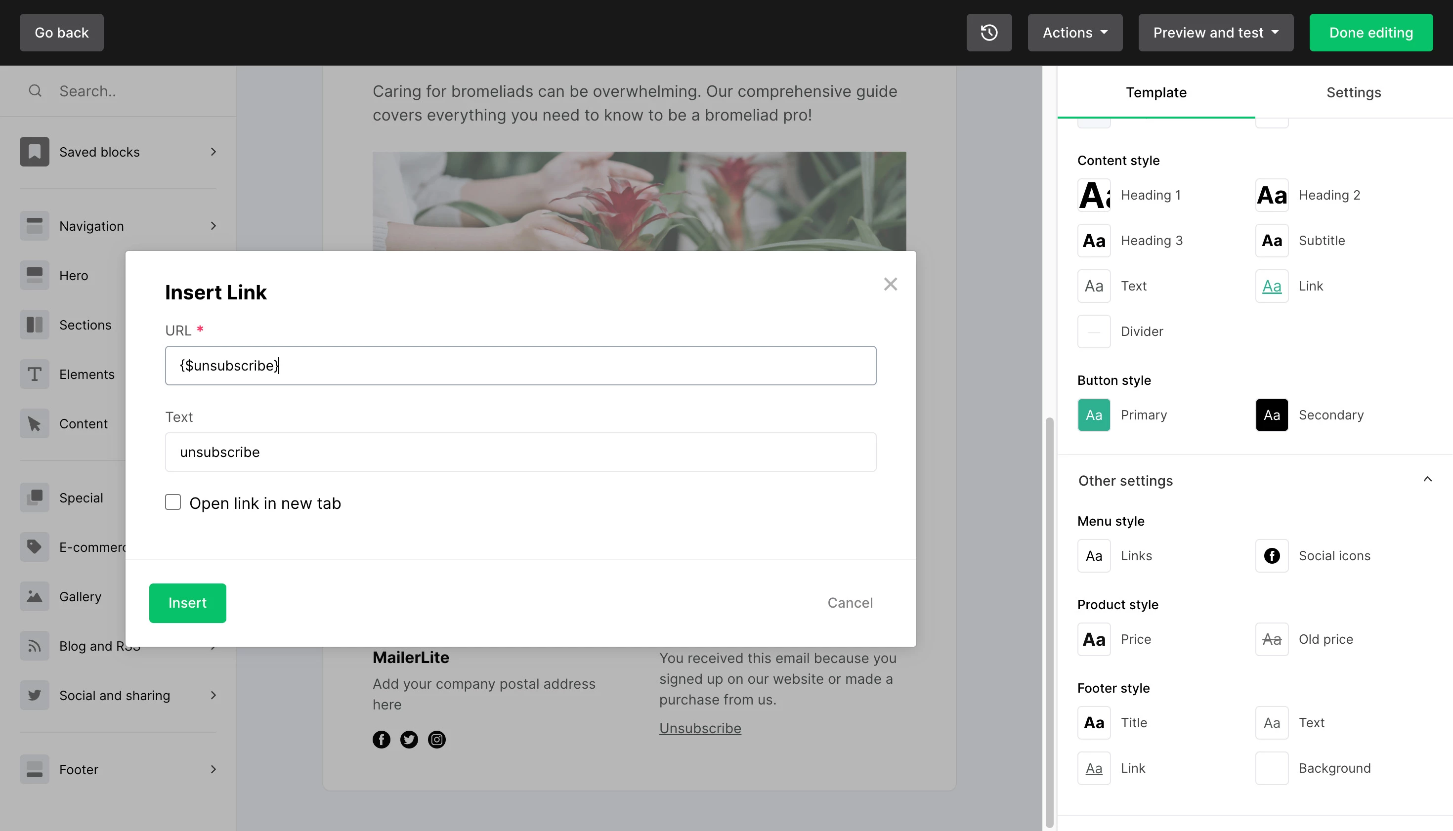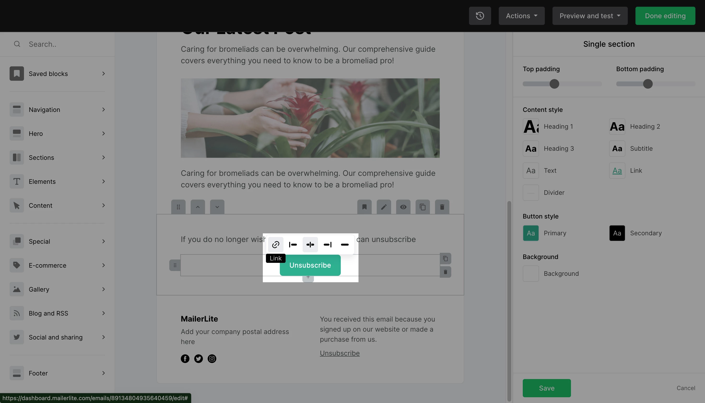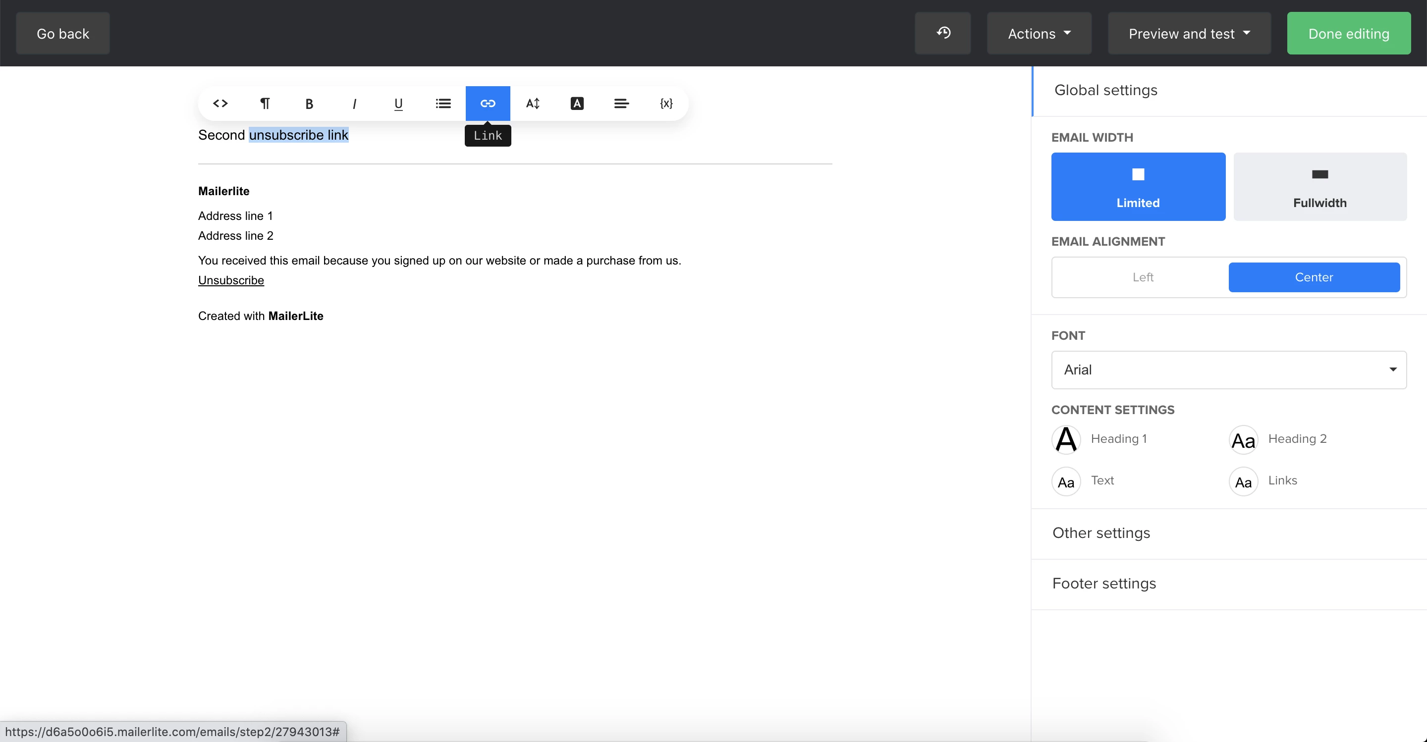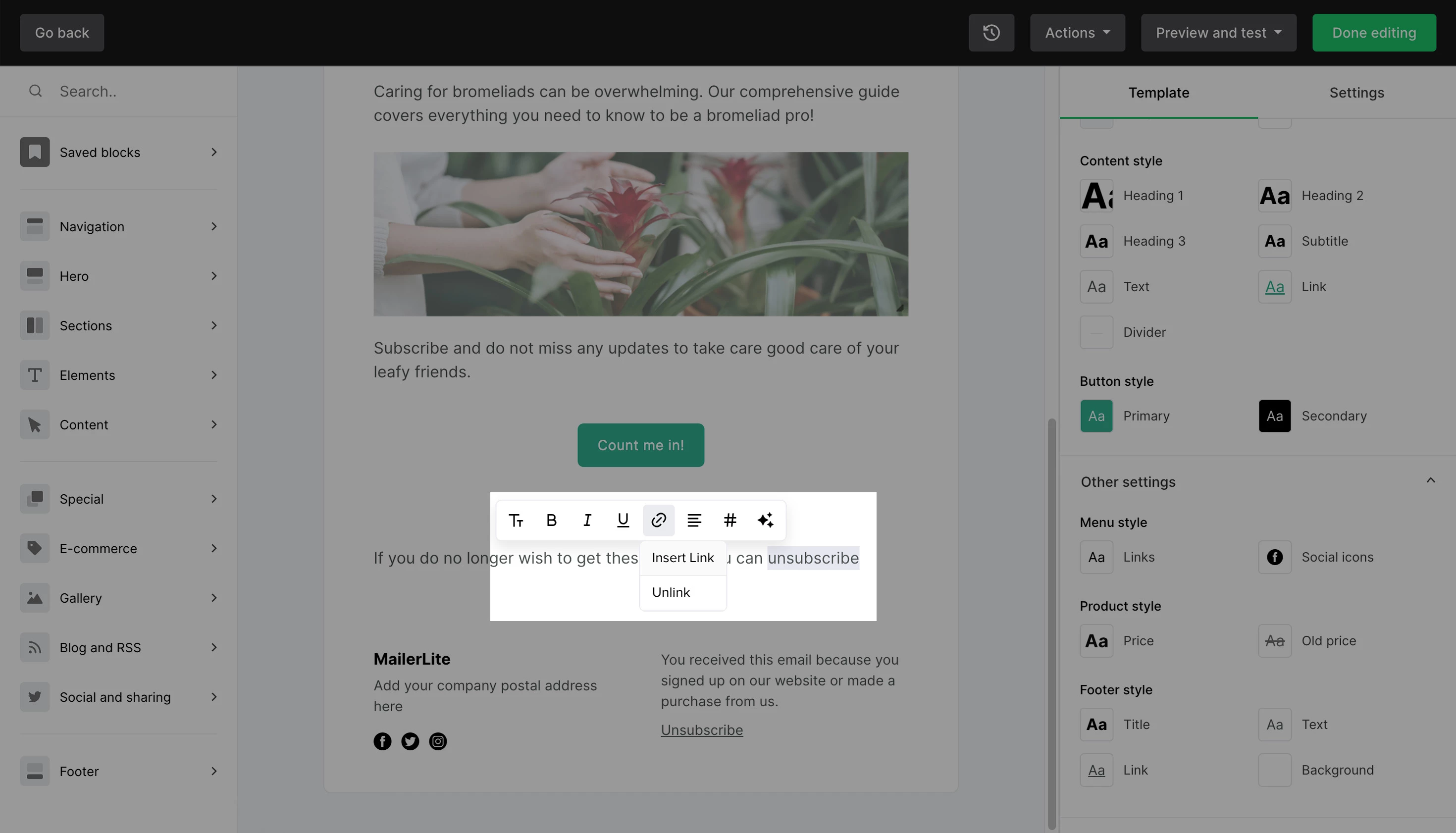 MailerLite automatically adds an unsubscribe link to the footer of your newsletter. However, you can also add an additional unsubscribe link anywhere in your newsletter.