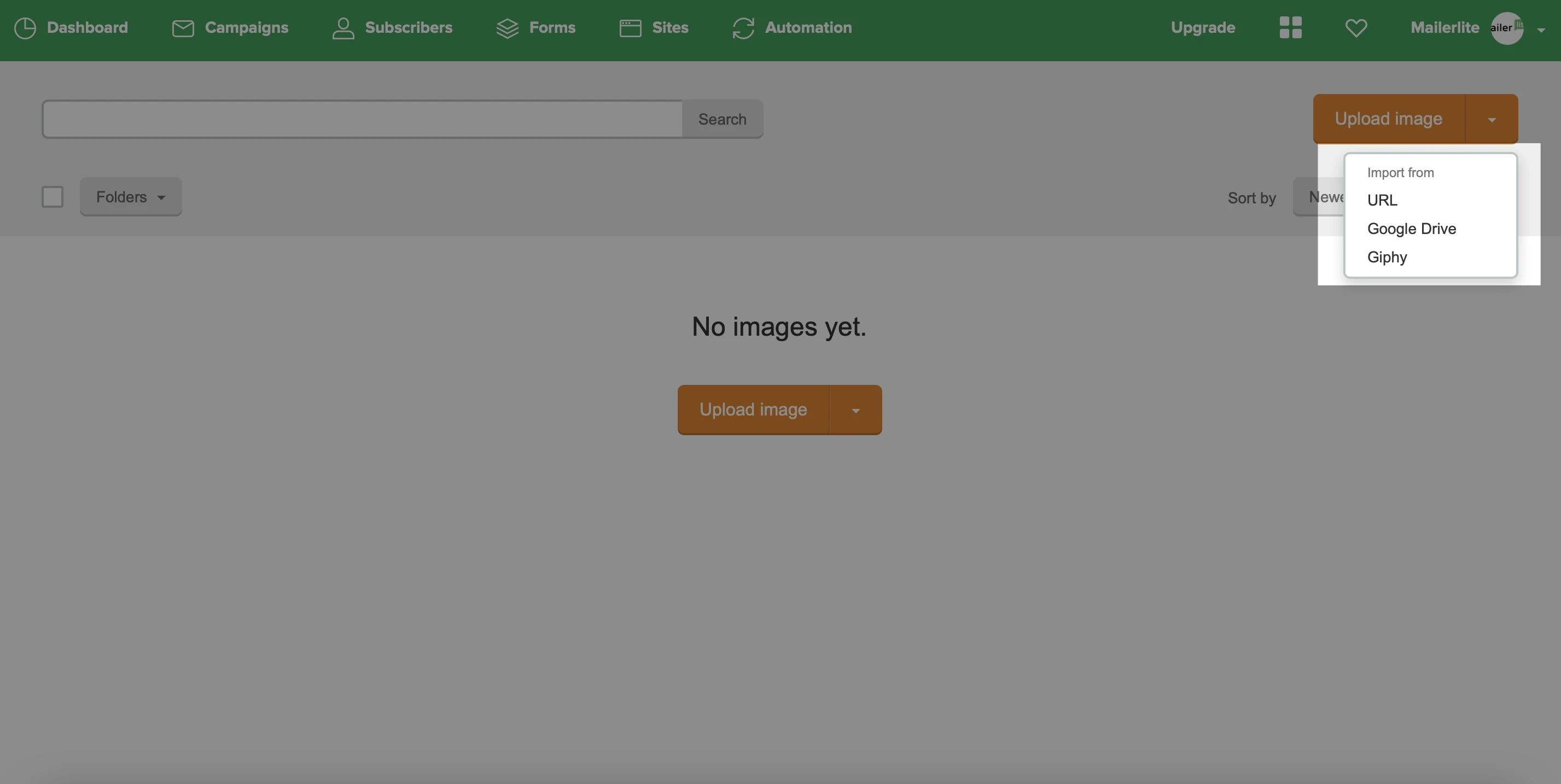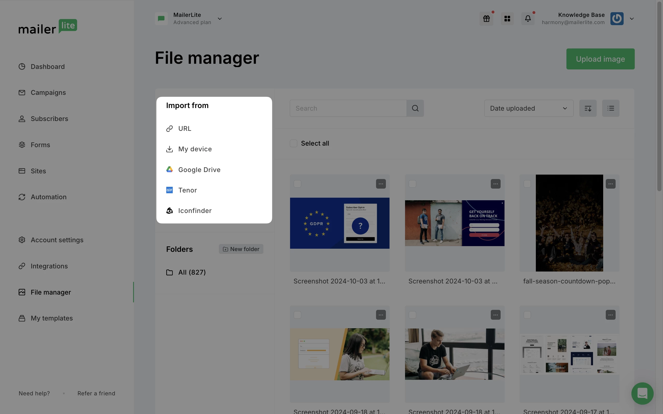 Here, you can click the Upload image button to import an image from your computer into your file manager. Or, you can click the downward-pointing arrow on the right-hand side of the button to import an image from a URL, Google Drive, Tenor or Iconfinder.